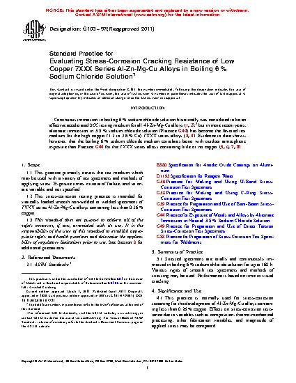 1.2 This stress-corrosion testing practice is intended for statically loaded smooth non-welded or welded specimens of 7XXX series Al-Zn-Mg-Cu alloys containing less than 0.26 % copper.