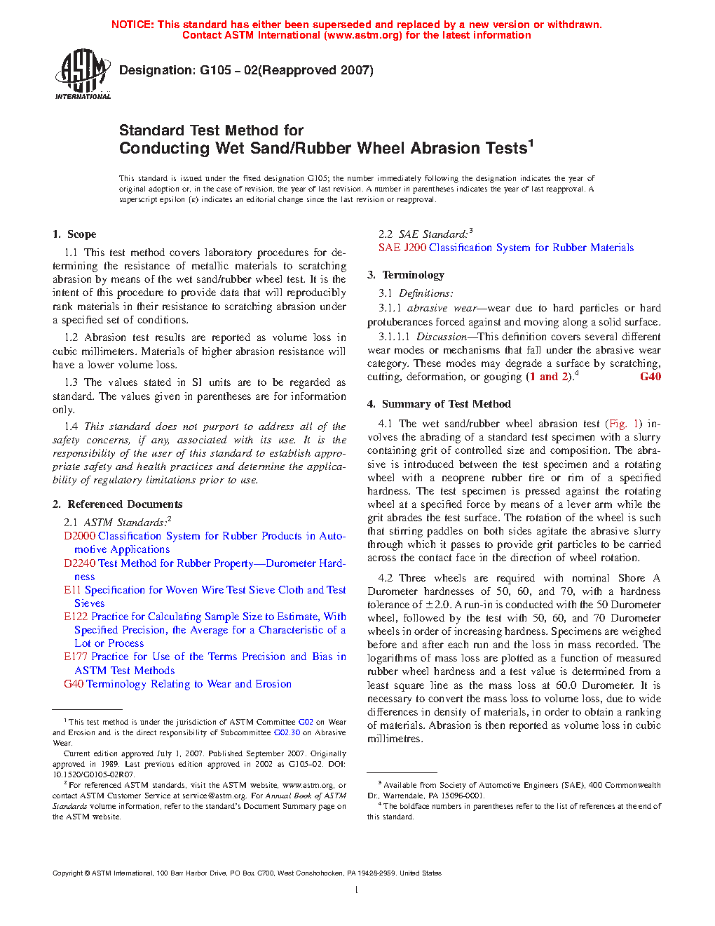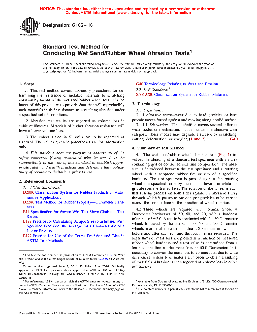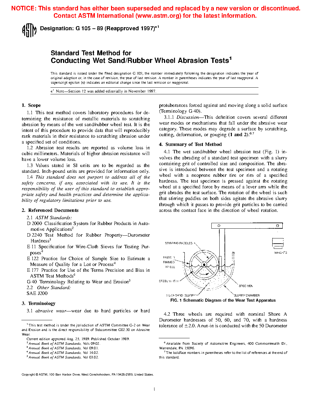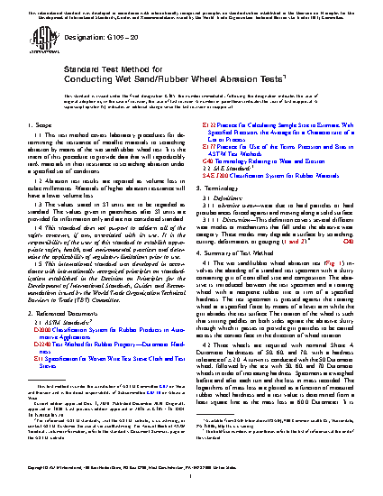 1.1 This test method covers laboratory procedures for determining the resistance of metallic materials to scratching abrasion by means of the wet sand/rubber wheel test. It is the intent of this procedure to provide data that will reproducibly rank materials in their resistance to scratching abrasion under a specified set of conditions.