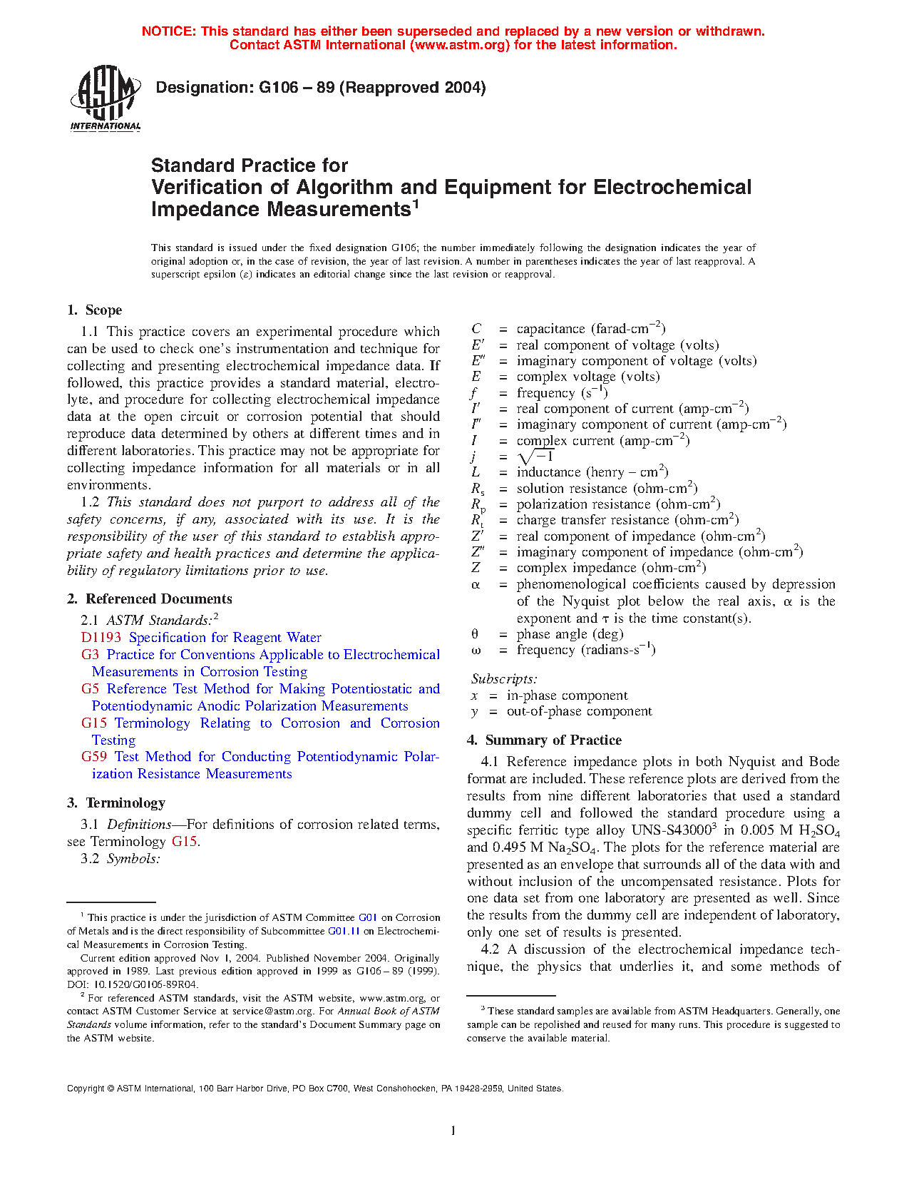 1.1 This practice covers an experimental procedure which can be used to check one's instrumentation and technique for collecting and presenting electrochemical impedance data. If followed, this practice provides a standard material, electrolyte, and procedure for collecting electrochemical impedance data at the open circuit or corrosion potential that should reproduce data determined by others at different times and in different laboratories. This practice may not be appropriate for collecting impedance information for all materials or in all environments.