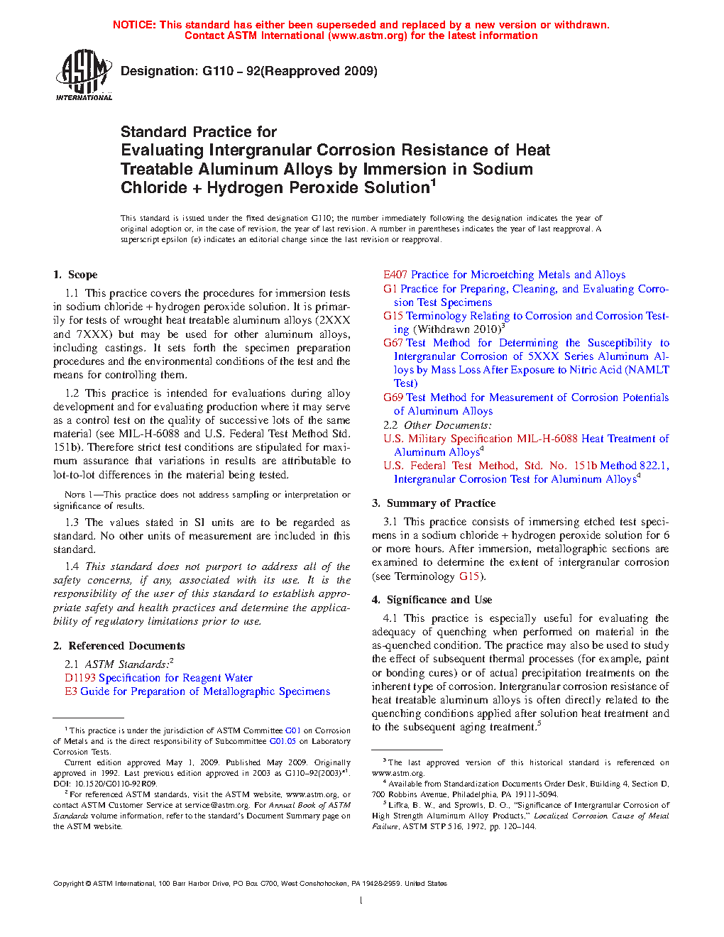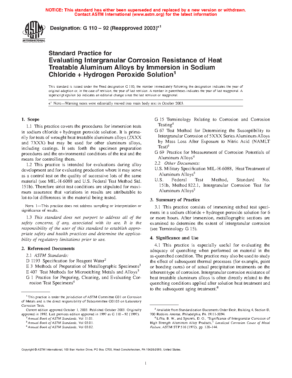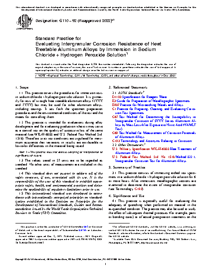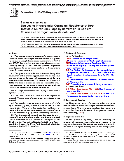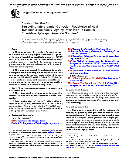 1.1 This practice covers the procedures for immersion tests in sodium chloride + hydrogen peroxide solution. It is primarily for tests of wrought heat treatable aluminum alloys (2XXX and 7XXX) but may be used for other aluminum alloys, including castings. It sets forth the specimen preparation procedures and the environmental conditions of the test and the means for controlling them.
