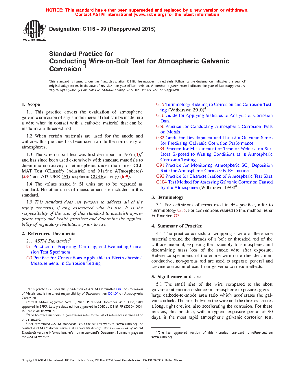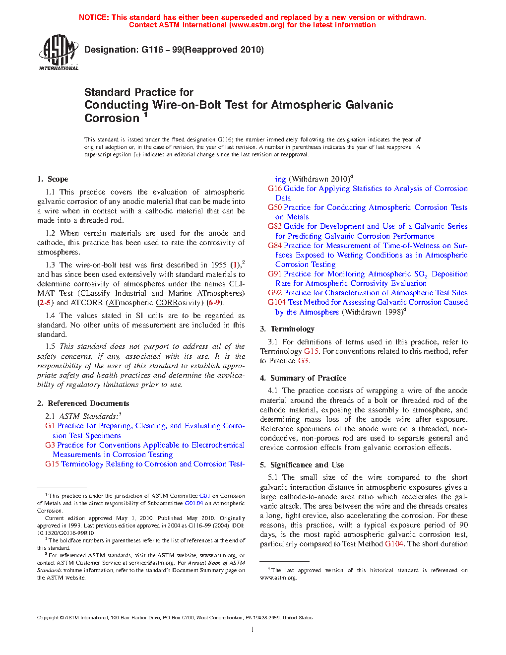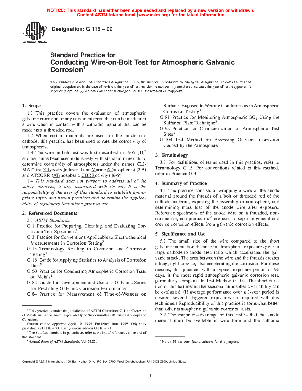 5.2 The major disadvantage of this test is that the anode material must be available in wire form and the cathodic material must be available in the form of a threaded rod. This should be compared to Test Method G104 where plate or sheet material is used exclusively.