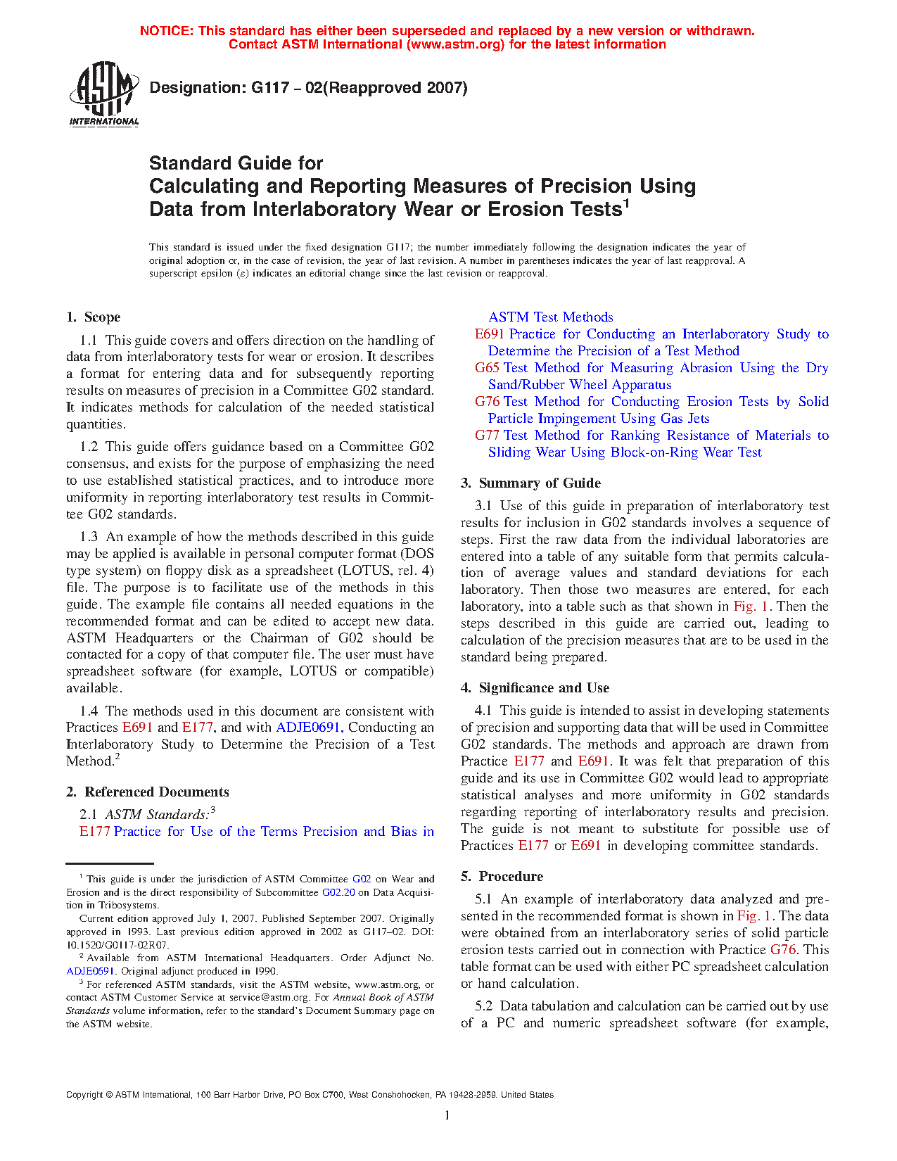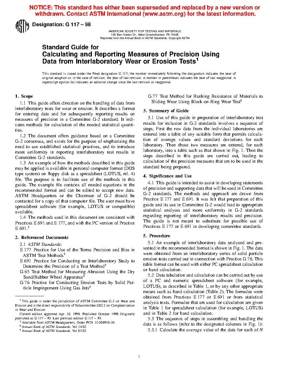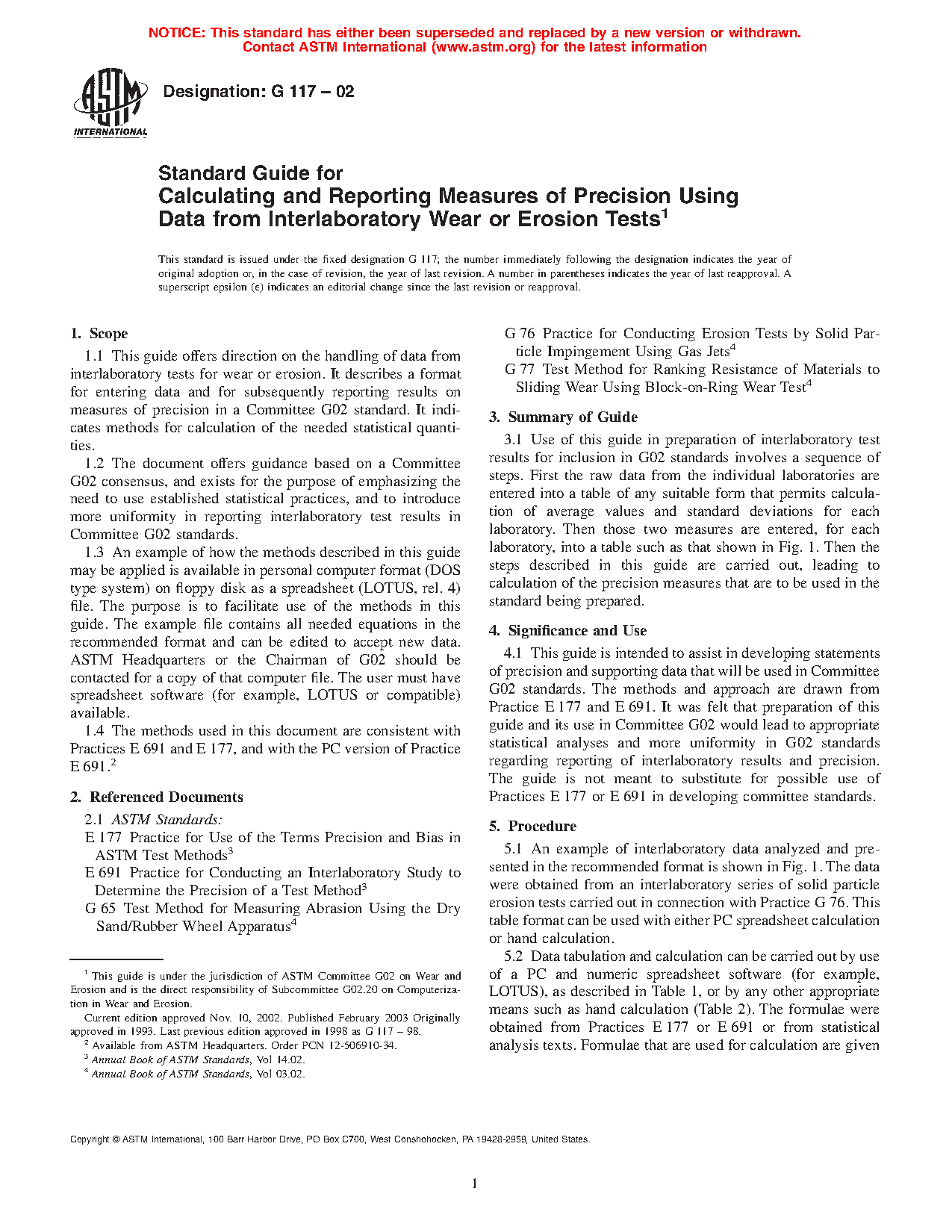 1.3 An example of how the methods described in this guide may be applied is available in personal computer format as a spreadsheet file. The purpose is to facilitate use of the methods in this guide. The example file contains all needed equations in the recommended format and can be edited to accept new data. Contact ASTM Headquarters or the Chairman of G02 for a copy of that computer file. The user must have spreadsheet software (EXCEL or compatible) available.