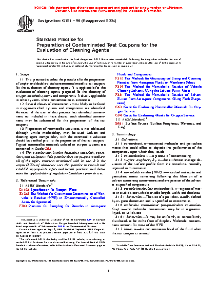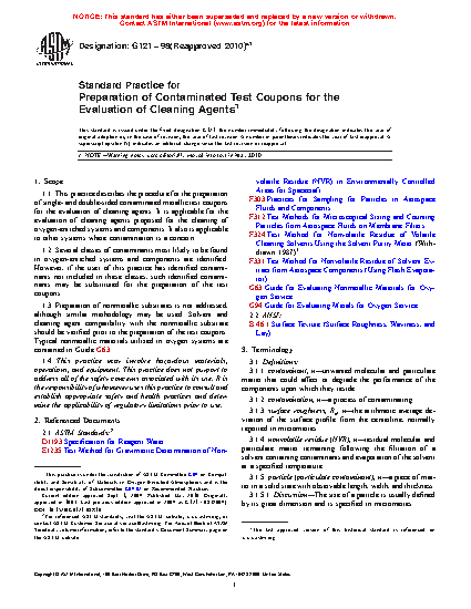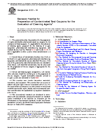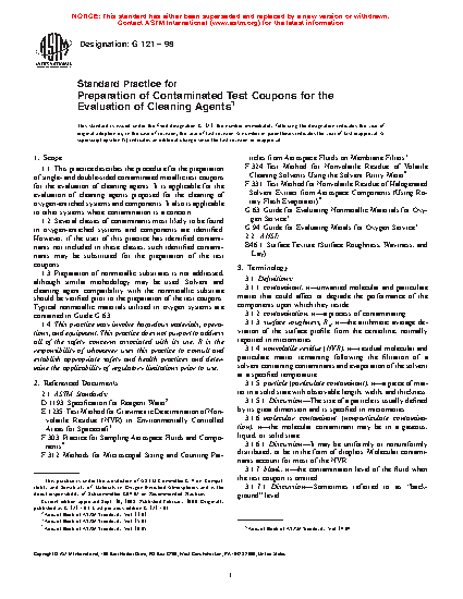 1.1 This practice describes the procedure for the preparation of single- and double-sided contaminated test coupons for the evaluation of cleaning agents. It is applicable for the evaluation of cleaning agents proposed for the cleaning of oxygen equipment, pharmaceutical manufacturing equipment, and medical devices (see Test Method G122 and Guide G127). It also is applicable to other systems where contamination is a concern.