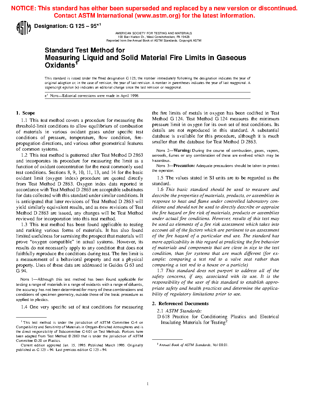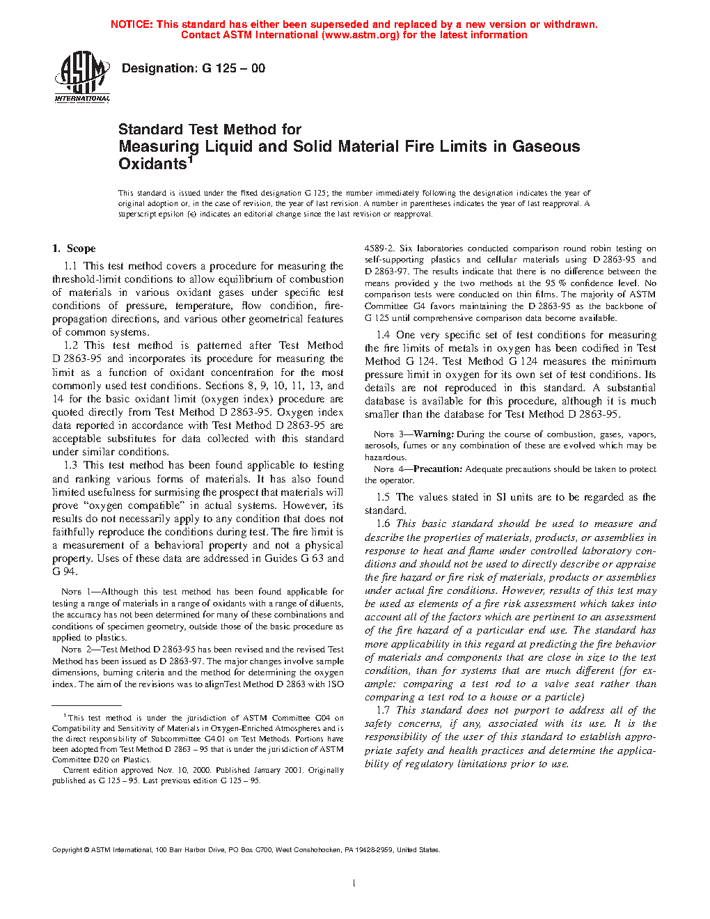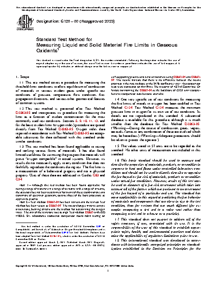 1.4 One very specific set of test conditions for measuring the fire limits of metals in oxygen has been codified in Test Method G124. Test Method G124 measures the minimum pressure limit in oxygen for its own set of test conditions. Its details are not reproduced in this standard. A substantial database is available for this procedure, although it is much smaller than the database for Test Method D2863-95.