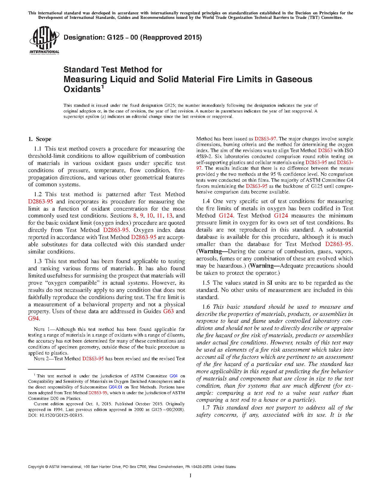 Note 2--Test Method D2863-95 has been revised and the revised Test Method has been issued as D2863-97. The major changes involve sample dimensions, burning criteria and the method for determining the oxygen index. The aim of the revisions was to alignTest Method D2863 with ISO 4589-2. Six laboratories conducted comparison round robin testing on self-supporting plastics and cellular materials using D2863-95 and D2863-97. The results indicate that there is no difference between the means provided y the two methods at the 95 % confidence level. No comparison tests were conducted on thin films. The majority of ASTM Committee G4 favors maintaining the D2863-95 as the backbone of G125 until comprehensive comparison data become available.