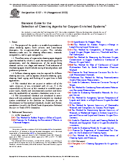 1.1 The purpose of this guide is to establish a procedure to select cleaning agents, both solvents and water-based detergents, for oxygen-enriched systems. This includes laboratory-scale tests for cleaning effectiveness, materials compatibility, and oxygen compatibility.