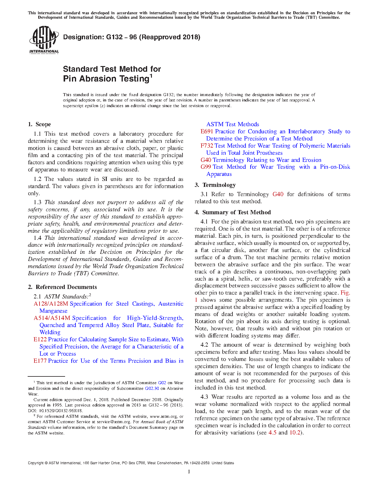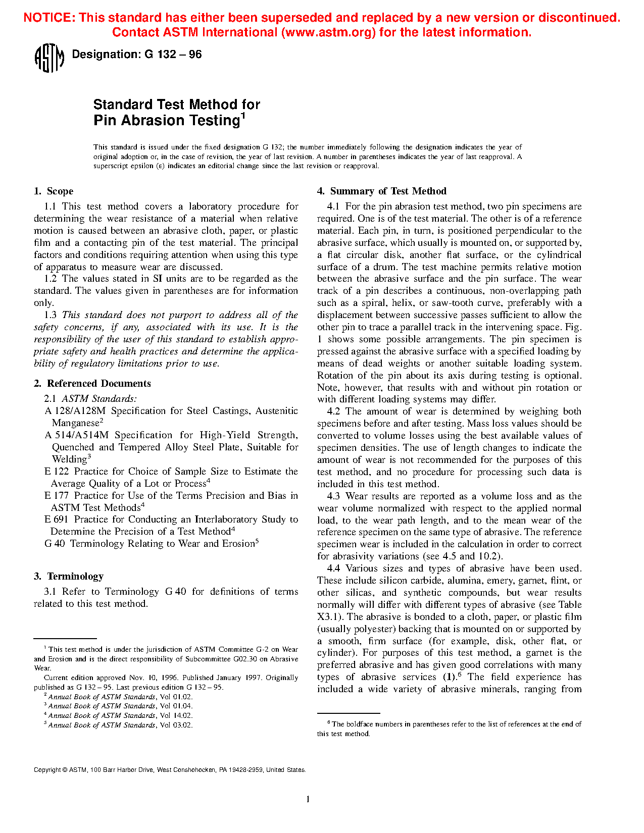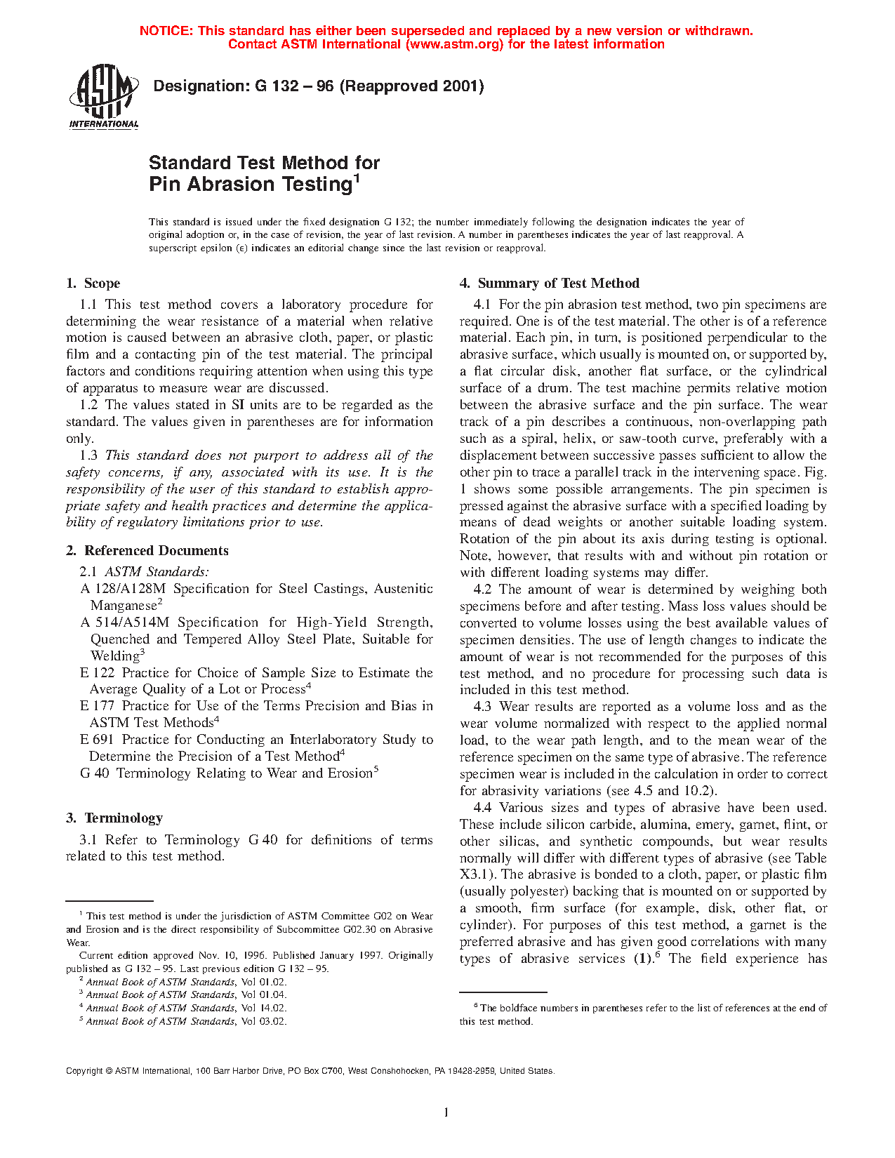 1.1 This test method covers a laboratory procedure for determining the wear resistance of a material when relative motion is caused between an abrasive cloth, paper, or plastic film and a contacting pin of the test material. The principal factors and conditions requiring attention when using this type of apparatus to measure wear are discussed.