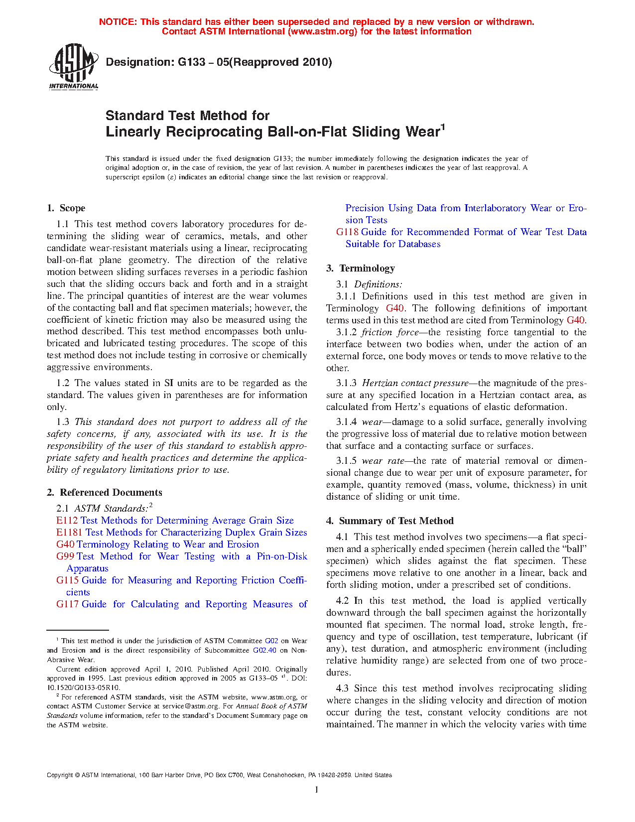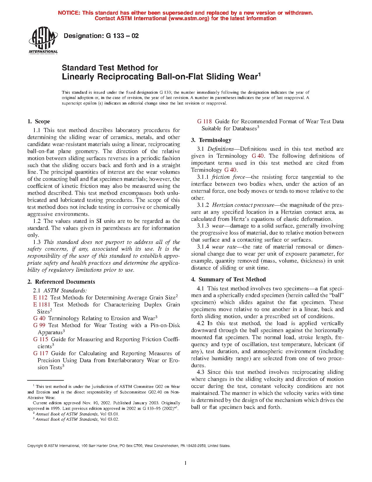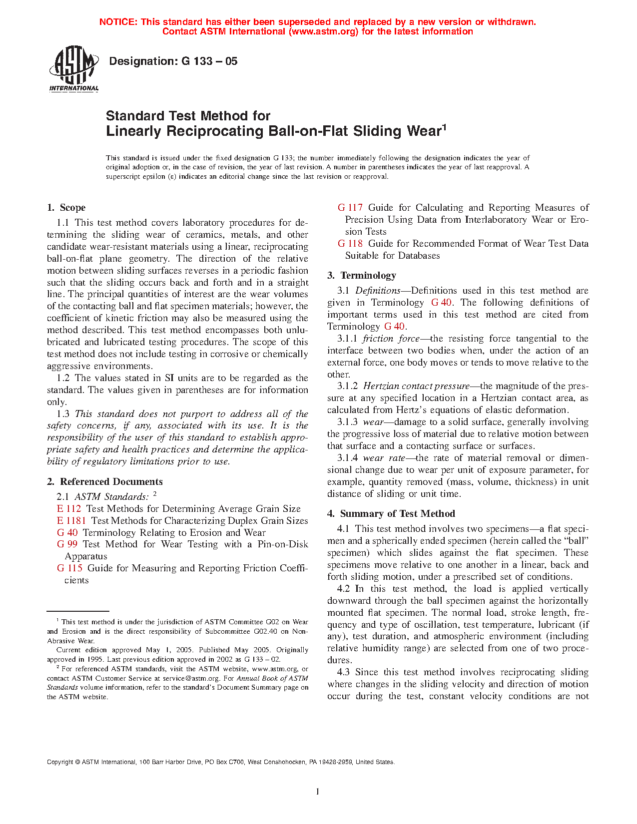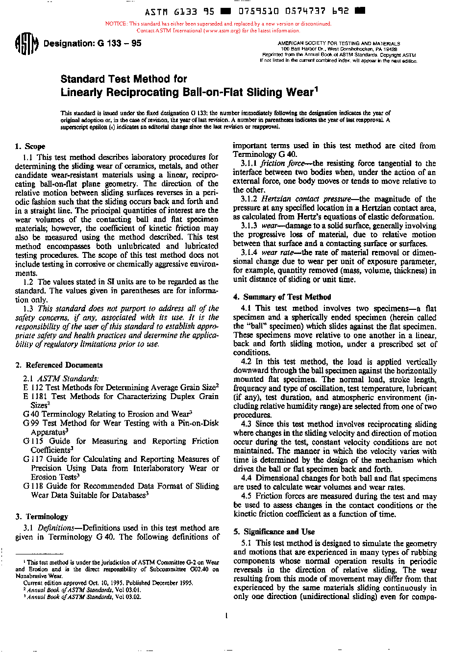1.1 This test method describes laboratory procedures for determining the sliding wear of ceramics, metals, and other candidate wear-resistant materials using a linear, reciprocating ball-on-flat plane geometry. The direction of the relative motion between sliding surfaces reverses in a periodic fashion such that the sliding occurs back and forth and in a straight line. The principal quantities of interest are the wear volumes of the contacting ball and flat specimen materials; however, the coefficient of kinetic friction may also be measured using the method described. This test method encompasses both unlubricated and lubricated testing procedures. The scope of this test method does not include testing in corrosive or chemically aggressive environments.