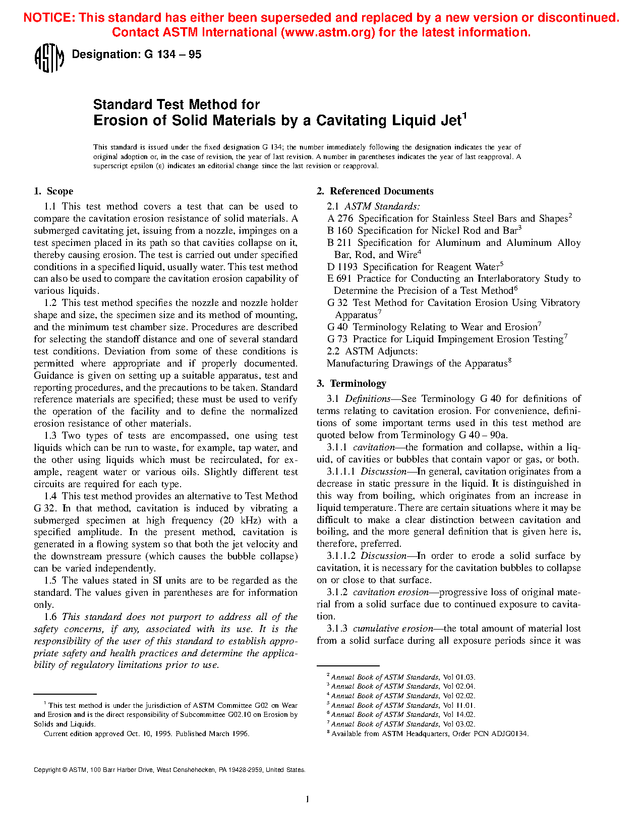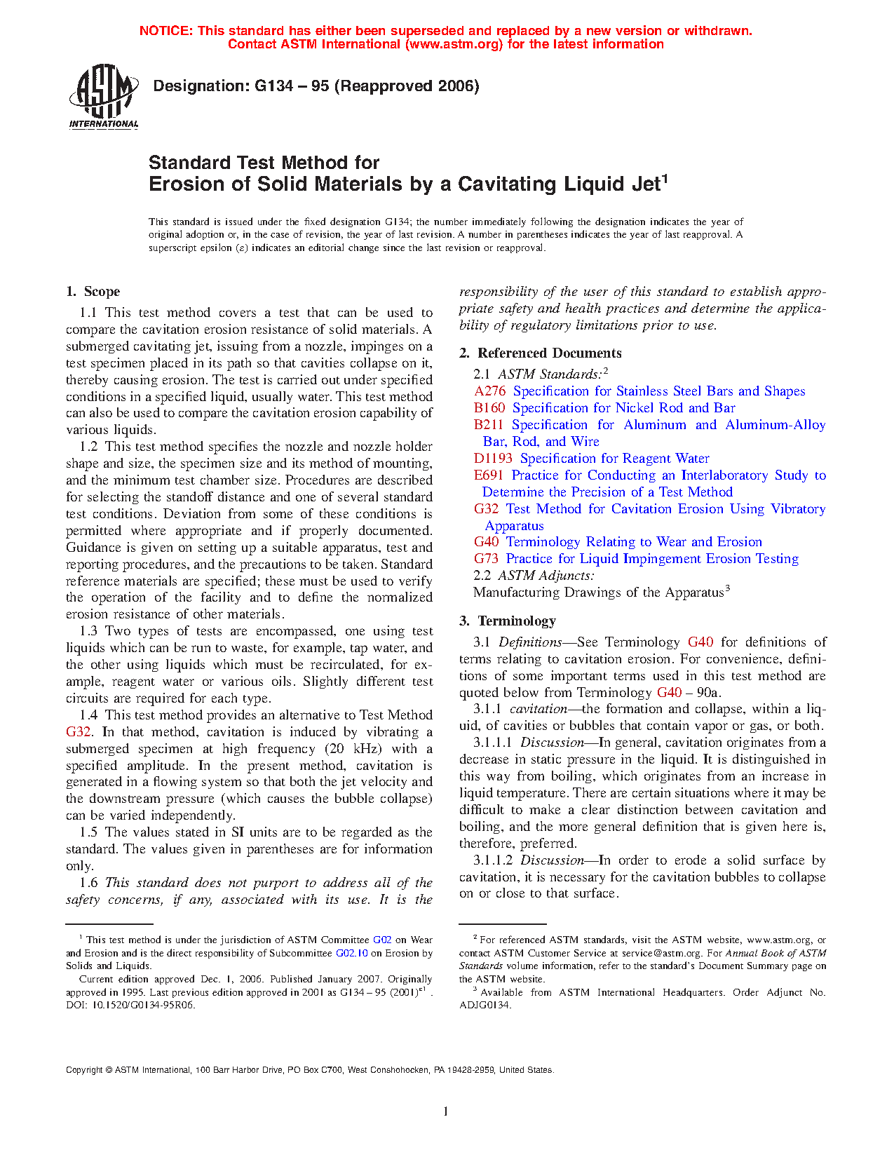 1.4 This test method provides an alternative to Test Method G32. In that method, cavitation is induced by vibrating a submerged specimen at high frequency (20 kHz) with a specified amplitude. In the present method, cavitation is generated in a flowing system so that both the jet velocity and the downstream pressure (which causes the bubble collapse) can be varied independently.