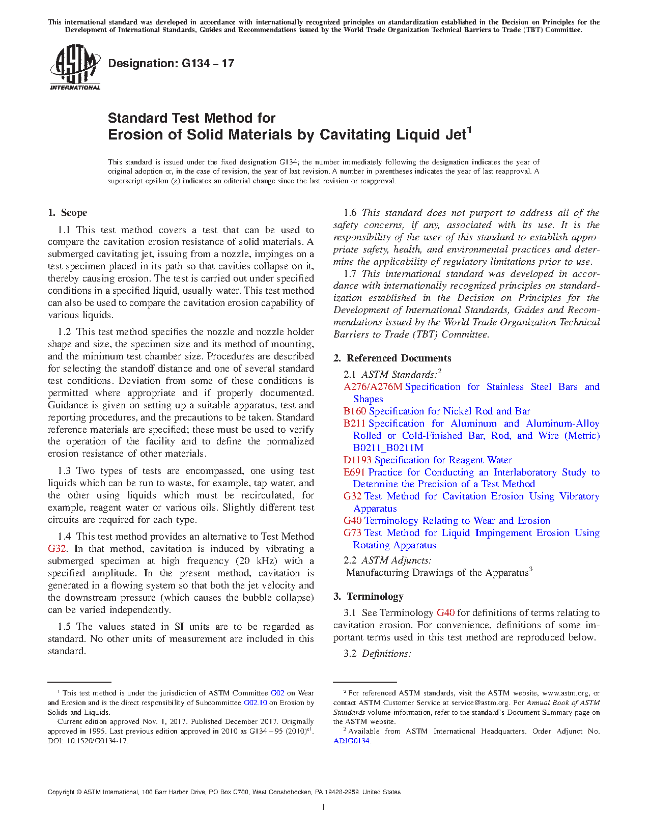 1.1 This test method covers a test that can be used to compare the cavitation erosion resistance of solid materials. A submerged cavitating jet, issuing from a nozzle, impinges on a test specimen placed in its path so that cavities collapse on it, thereby causing erosion. The test is carried out under specified conditions in a specified liquid, usually water. This test method can also be used to compare the cavitation erosion capability of various liquids.