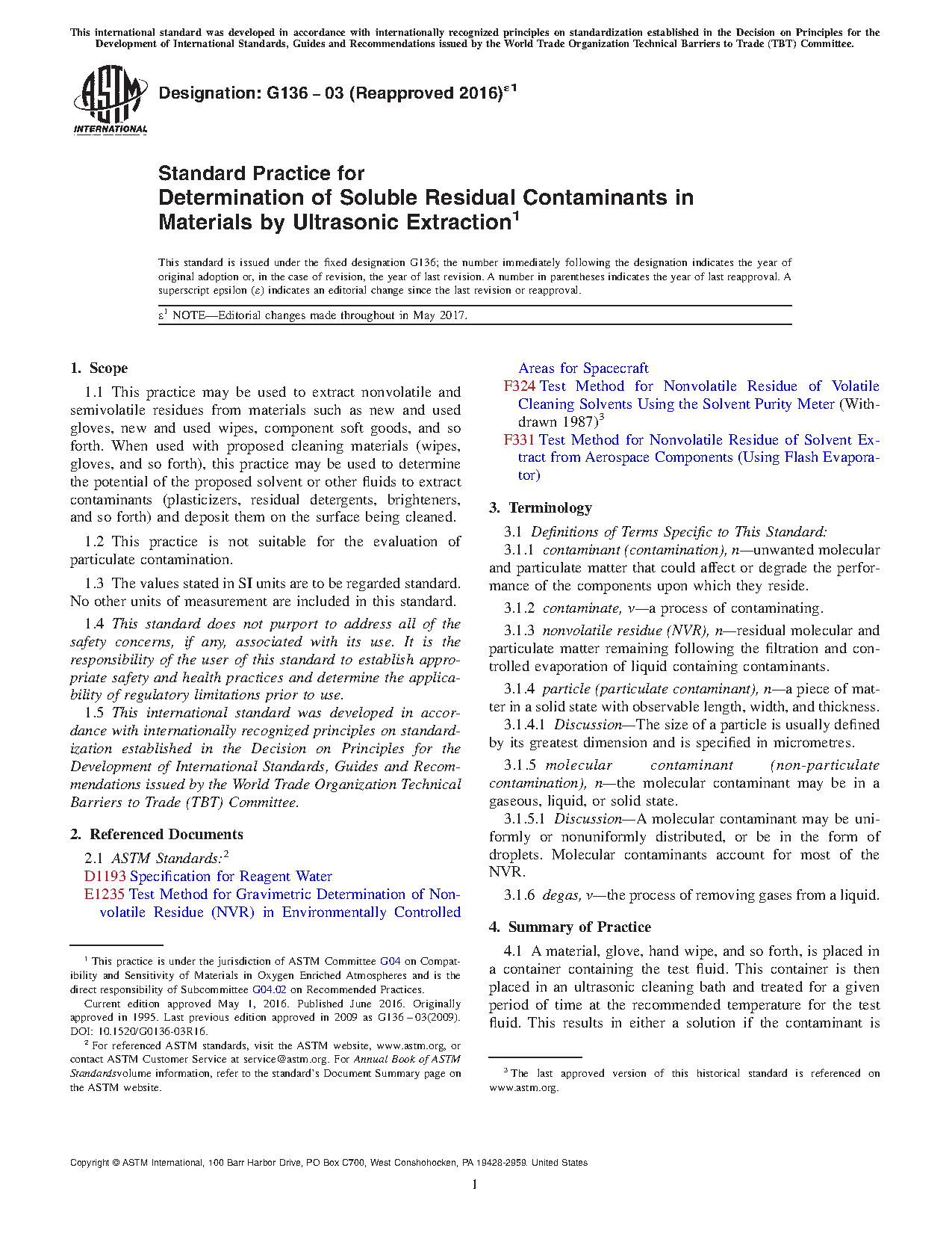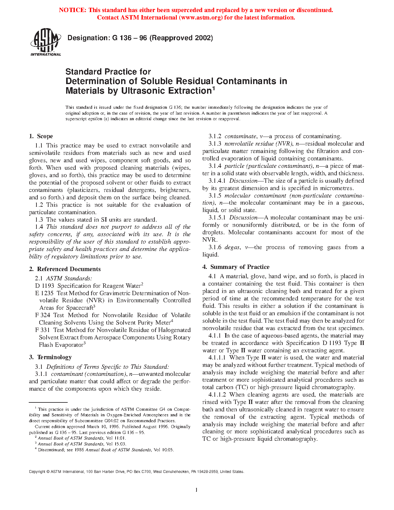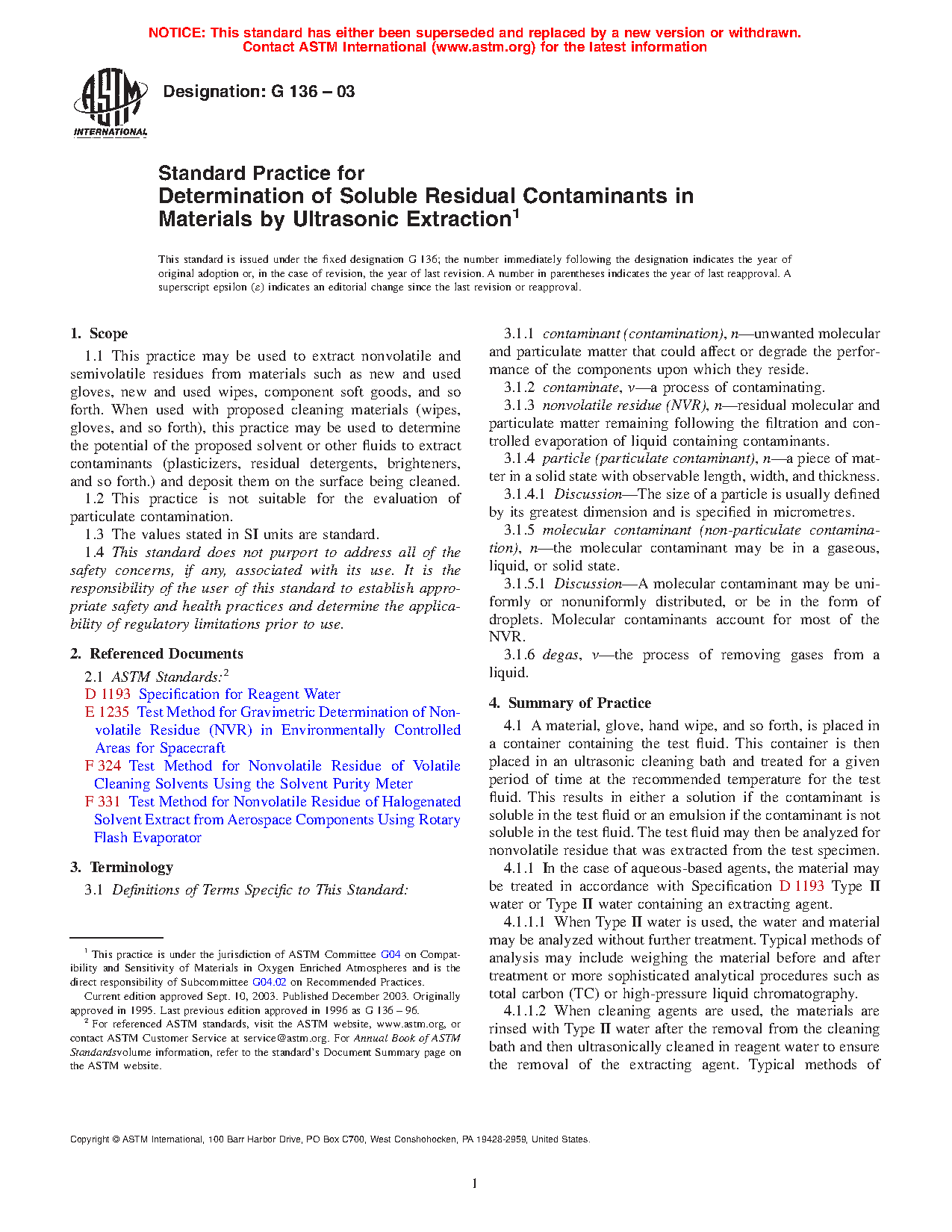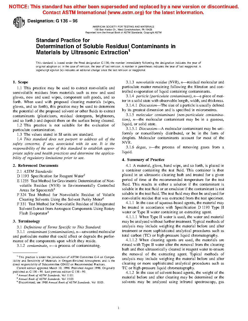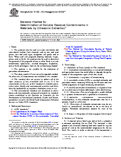 1.1 This practice may be used to extract nonvolatile and semivolatile residues from materials such as new and used gloves, new and used wipes, component soft goods, and so forth. When used with proposed cleaning materials (wipes, gloves, and so forth), this practice may be used to determine the potential of the proposed solvent or other fluids to extract contaminants (plasticizers, residual detergents, brighteners, and so forth.) and deposit them on the surface being cleaned.
