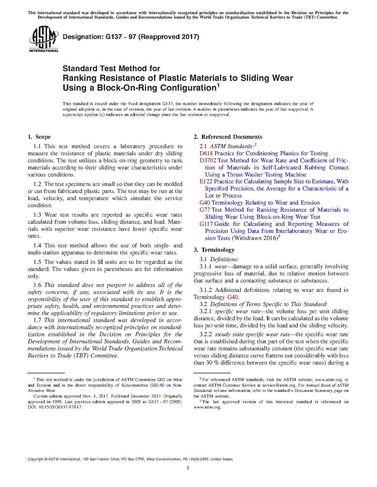 1.1 This test method covers a laboratory procedure to measure the resistance of plastic materials under dry sliding conditions. The test utilizes a block-on-ring geometry to rank materials according to their sliding wear characteristics under various conditions.