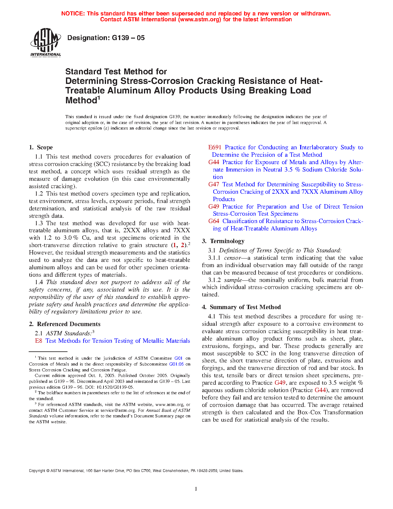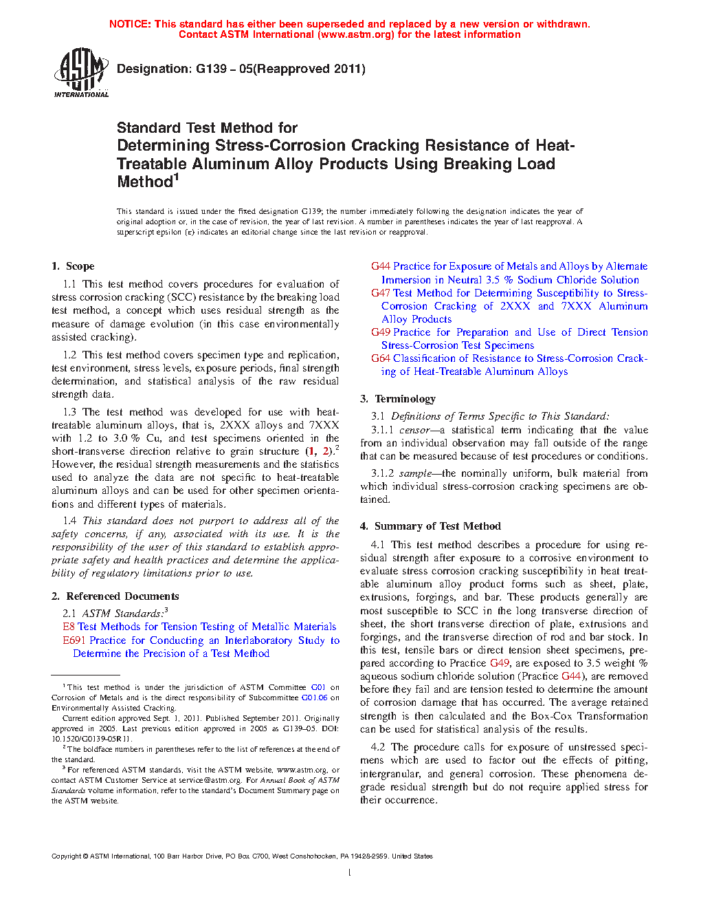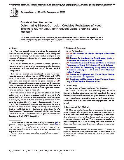 1.3 The test method was developed for use with heat-treatable aluminum alloys, that is, 2XXX alloys and 7XXX with 1.2 to 3.0 % Cu, and test specimens oriented in the short-transverse direction relative to grain structure (1, 2). However, the residual strength measurements and the statistics used to analyze the data are not specific to heat-treatable aluminum alloys and can be used for other specimen orientations and different types of materials.