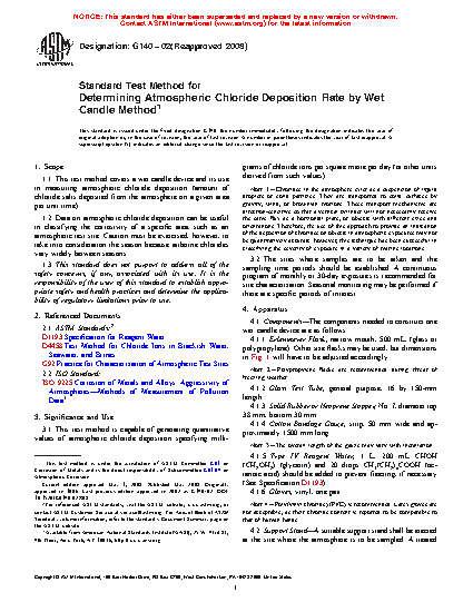 1.1 This test method covers a wet candle device and its use in measuring atmospheric chloride deposition (amount of chloride salts deposited from the atmosphere on a given area per unit time).