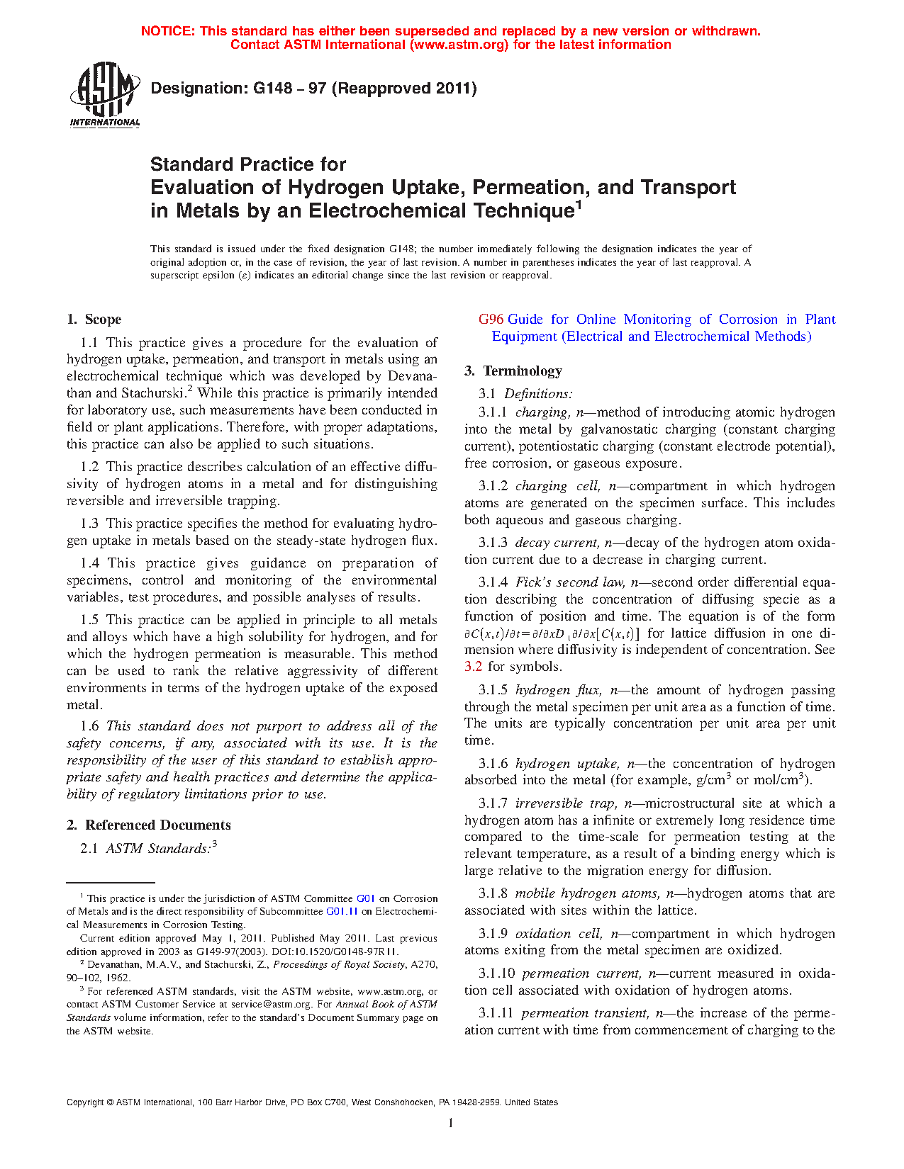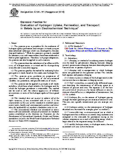1.1 This practice gives a procedure for the evaluation of hydrogen uptake, permeation, and transport in metals using an electrochemical technique which was developed by Devanathan and Stachurski. While this practice is primarily intended for laboratory use, such measurements have been conducted in field or plant applications. Therefore, with proper adaptations, this practice can also be applied to such situations.