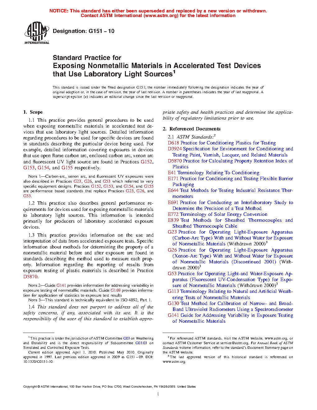 Note 1: Carbon-arc, xenon arc, and fluorescent UV exposures were also described in Practices G23, G26, and G53 which referred to very specific equipment designs. Practices G152, G153, and G154, and G155 are performance based standards that replace Practices G23, G26, and G53.