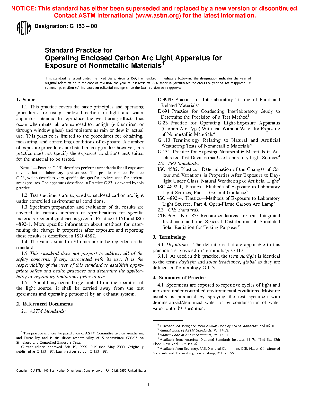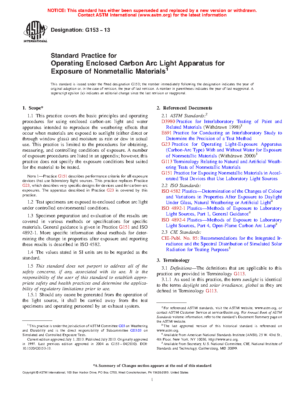 1.1 This practice covers the basic principles and operating procedures for using enclosed carbon-arc light and water apparatus intended to reproduce the weathering effects that occur when materials are exposed to sunlight (either direct or through window glass) and moisture as rain or dew in actual use. This practice is limited to the procedures for obtaining, measuring, and controlling conditions of exposure. A number of exposure procedures are listed in an appendix; however, this practice does not specify the exposure conditions best suited for the material to be tested.
