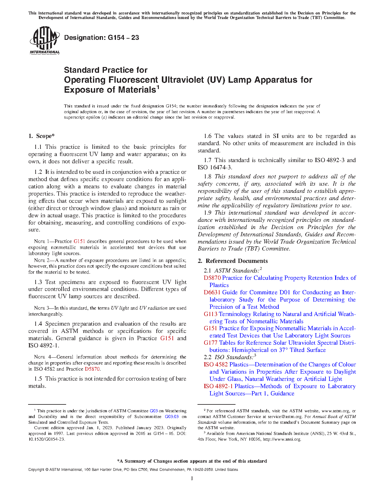 1.1 This practice covers the basic principles and operating procedures for using fluorescent UV light, and water apparatus intended to reproduce the weathering effects that occur when materials are exposed to sunlight (either direct or through window glass) and moisture as rain or dew in actual usage. This practice is limited to the procedures for obtaining, measuring, and controlling conditions of exposure. A number of exposure procedures are listed in an appendix; however, this practice does not specify the exposure conditions best suited for the material to be tested.