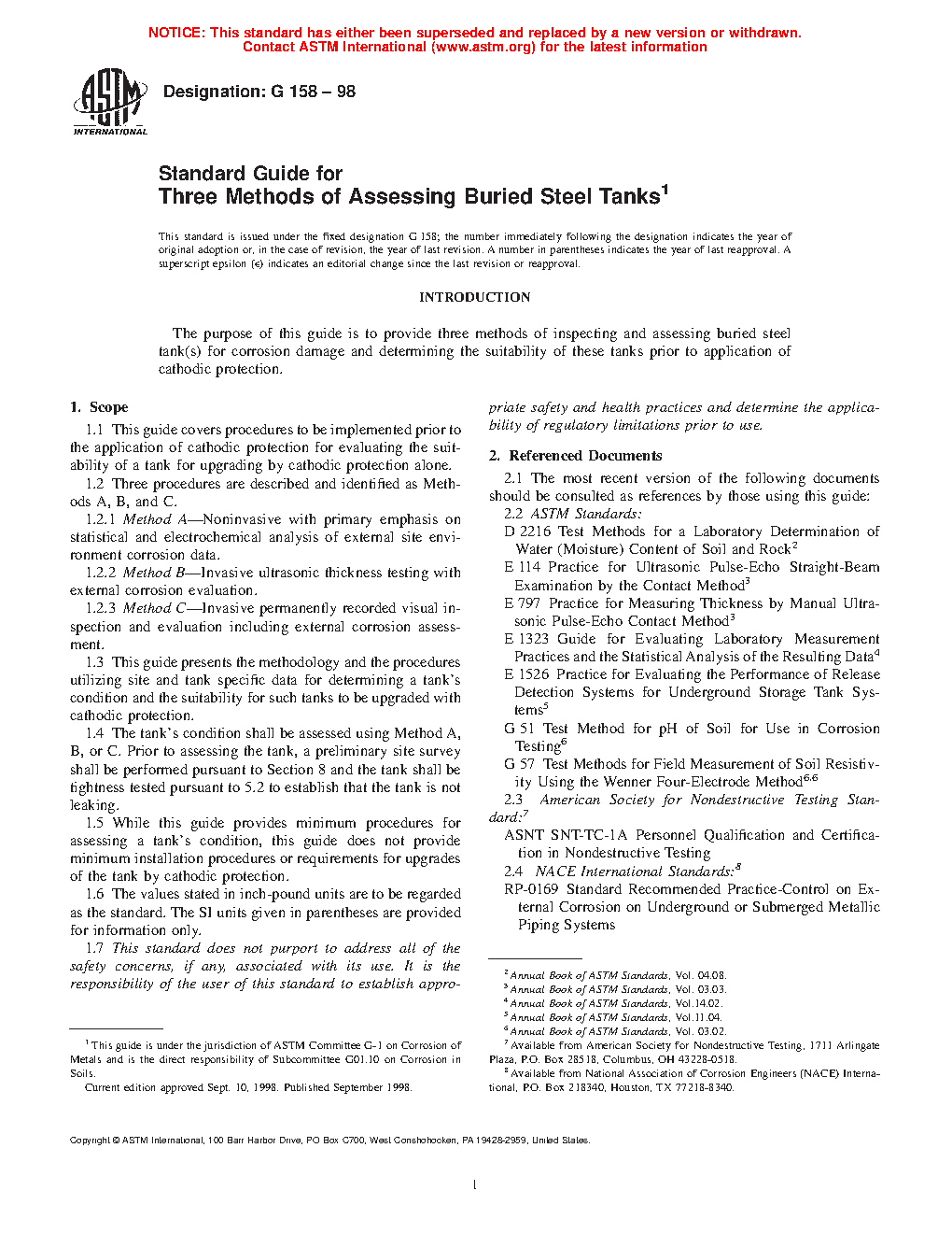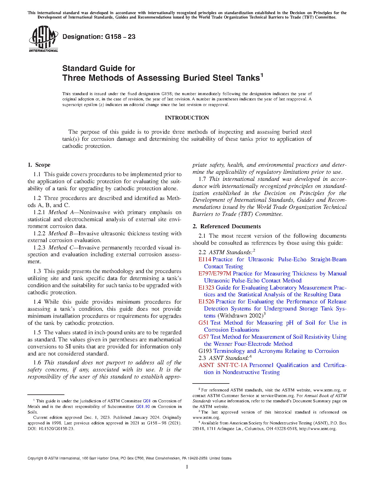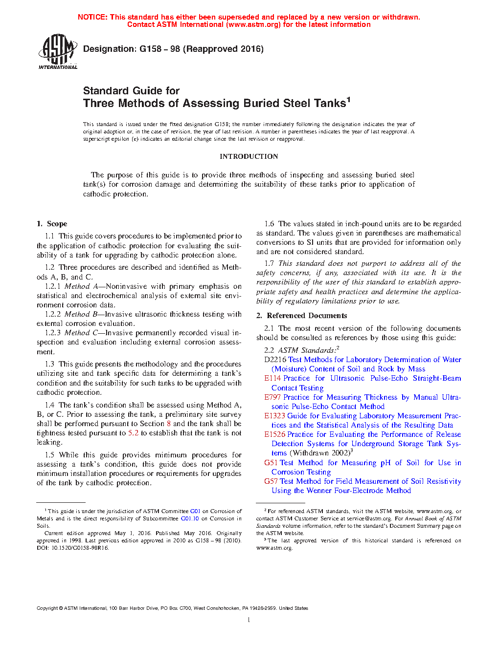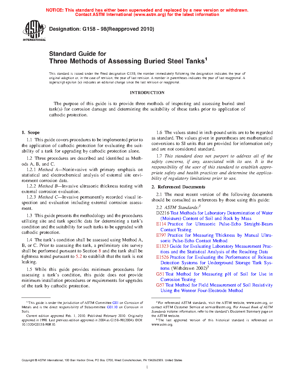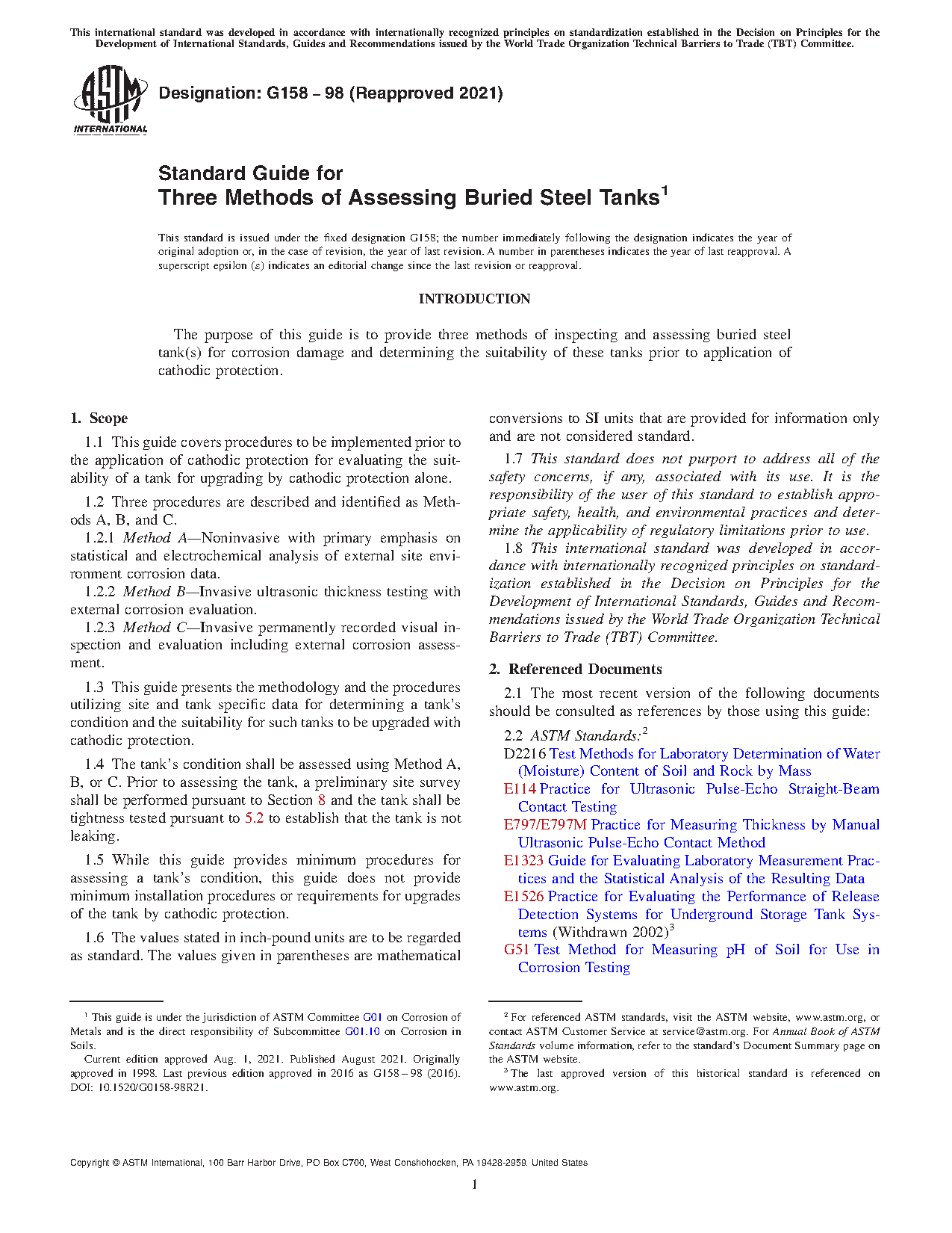 1.4 The tank's condition shall be assessed using Method A, B, or C. Prior to assessing the tank, a preliminary site survey shall be performed pursuant to Section 8 and the tank shall be tightness tested pursuant to 5.2 to establish that the tank is not leaking.