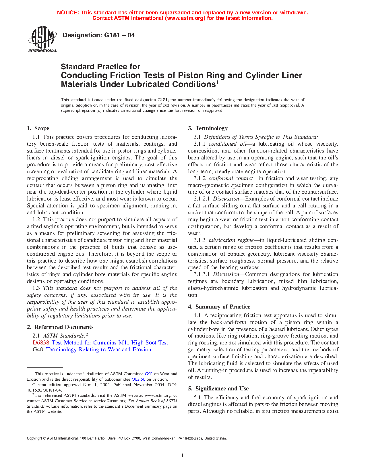 5.1 The efficiency and fuel economy of spark ignition and diesel engines is affected in part by the friction between moving parts. Although no reliable, in situ friction measurements exist for fired internal combustion engines, it has been estimated that at least half of the friction losses in such engines are due to those at the ring and liner interface. This test method involves the use of a reciprocating sliding arrangement to simulate the type of oscillating contact that occurs between a piston ring and its mating cylinder bore surface near the top-dead-center position in the cylinder where most severe surface contact conditions occur. There are many types of engines and engine operating environments; therefore, to allow the user the flexibility to tailor this test to conditions representative of various engines, this standard test method allows flexibility in selecting test loads, speeds, lubricants, and durations of testing. Variables that can be adjusted in this procedure include: normal force, speed of oscillation, stroke length, duration of testing, temperature of testing, method of specimen surface preparation, and the materials and lubricants to be evaluated. Guidance is provided here on the set-up of the test, the manner of specimen fixturing and alignment, the selection of a lubricant to simulate conditioned oil characteristics (for a diesel engine), and the means to run-in the ring specimens to minimize variability in test results.