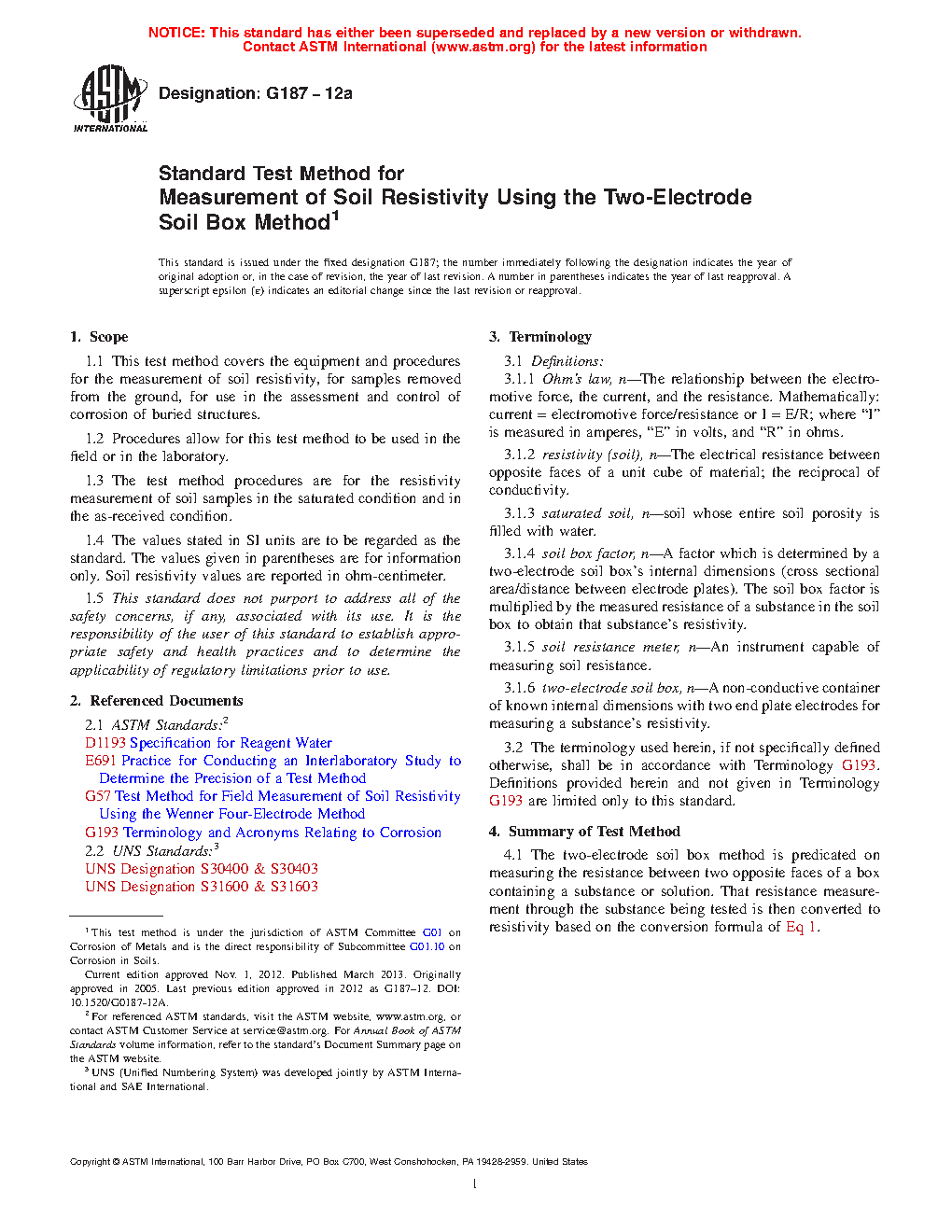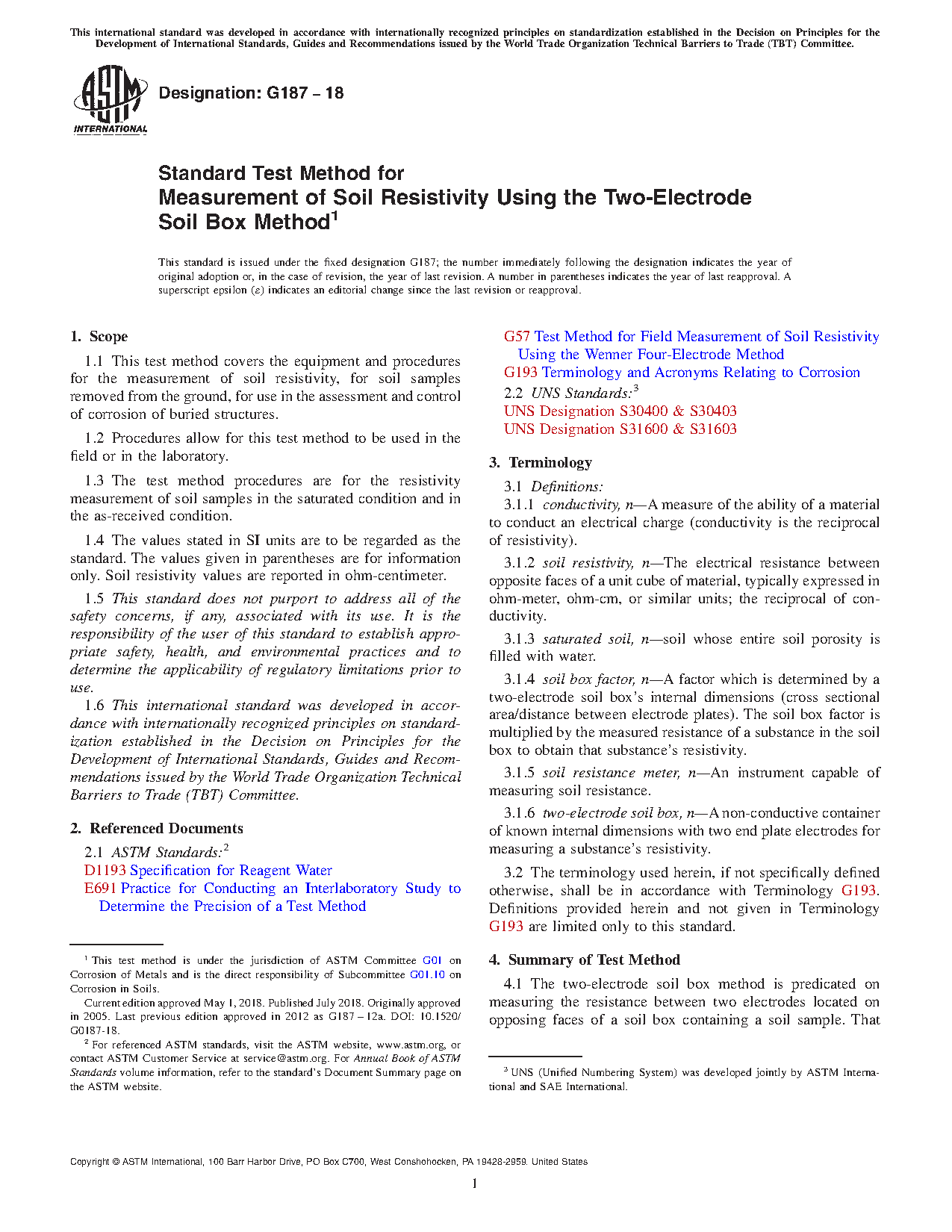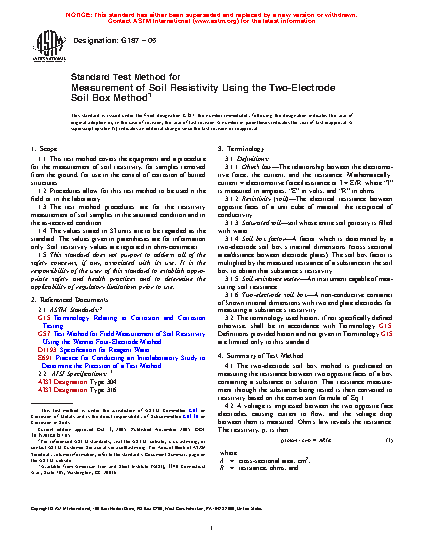 5.3 The test method is focused to provide an accurate, expeditious measurement of soil resistivity to assist in the determination of a soil’s corrosive nature. Test Method G57 emphasizes an in situ measurement commonly utilized in the design of a buried structures’ corrosion control (cathodic protection systems’ ground bed design, and so forth). The two-electrode soil box method often compliments the four-pin, in situ soil resistivity method.