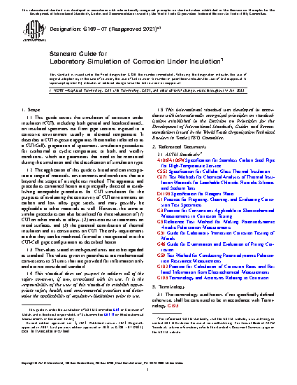 1.2 The application of this guide is broad and can incorporate a range of materials, environments and conditions that are beyond the scope of a single test method. The apparatus and procedures contained herein are principally directed at establishing acceptable procedures for CUI simulation for the purposes of evaluating the corrosivity of CUI environments on carbon and low alloy pipe steels, and may possibly be applicable to other materials as well. However, the same or similar procedures can also be utilized for the evaluation of (1) CUI on other metals or alloys, (2) anti-corrosive treatments on metal surfaces, and (3) the potential contribution of thermal insulation and its constituents on CUI. The only requirements are that they can be machined, formed or incorporated into the CUI-Cell pipe configuration as described herein.