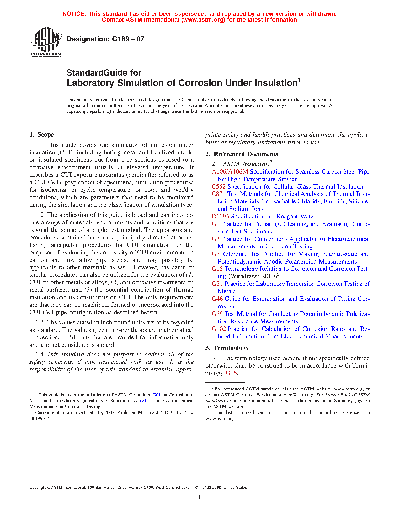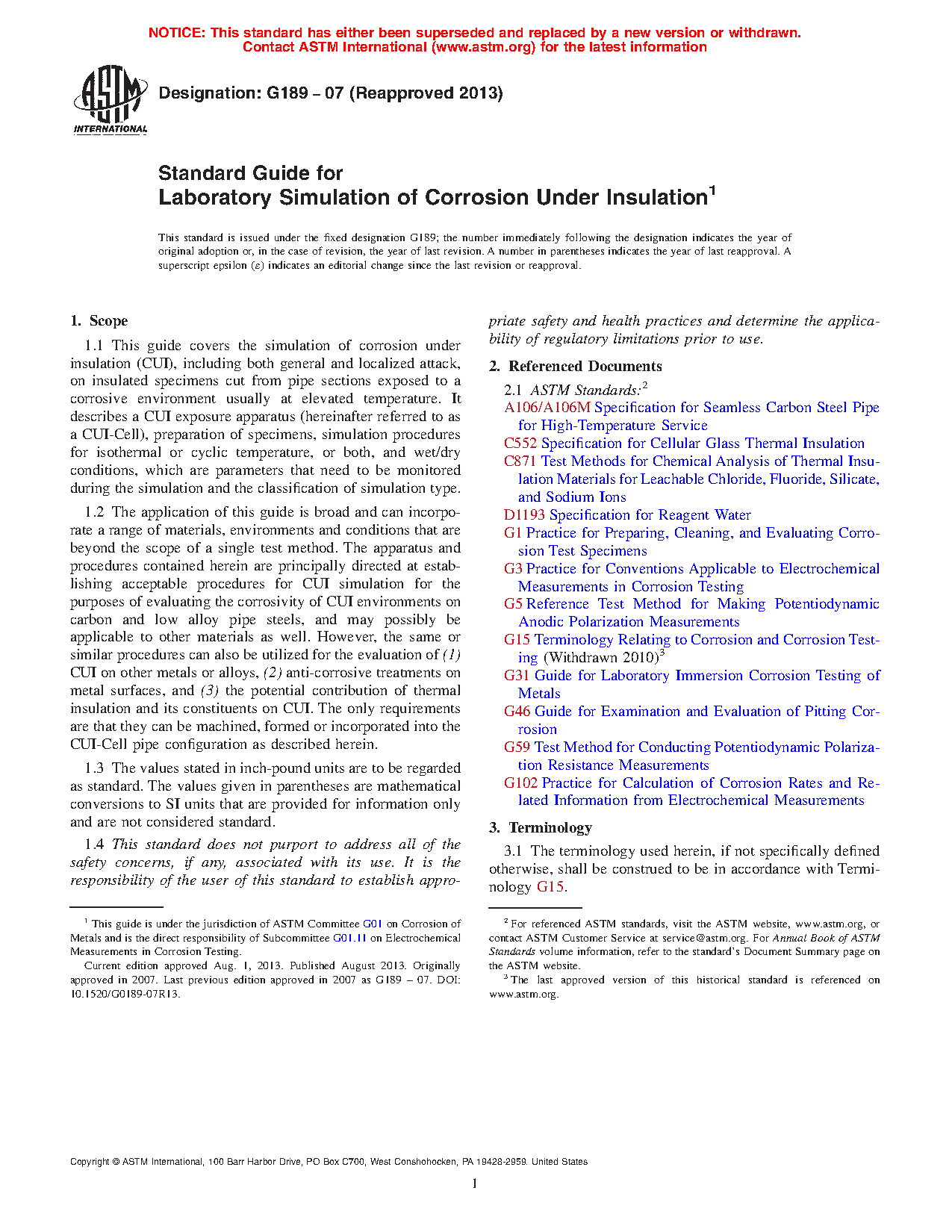 1.1 This guide covers the simulation of corrosion under insulation (CUI), including both general and localized attack, on insulated specimens cut from pipe sections exposed to a corrosive environment usually at elevated temperature. It describes a CUI exposure apparatus (hereinafter referred to as a CUI-Cell), preparation of specimens, simulation procedures for isothermal or cyclic temperature, or both, and wet/dry conditions, which are parameters that need to be monitored during the simulation and the classification of simulation type.
