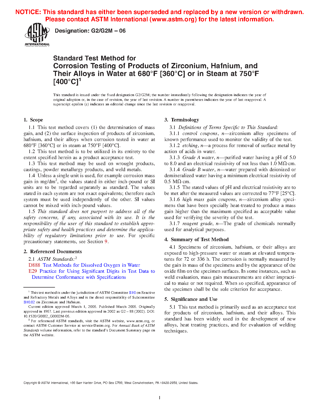 1.1 This test method covers (1) the determination of mass gain, and (2) the surface inspection of products of zirconium, hafnium, and their alloys when corrosion tested in water at 680°F [360°C] or in steam at 750°F [400°C].