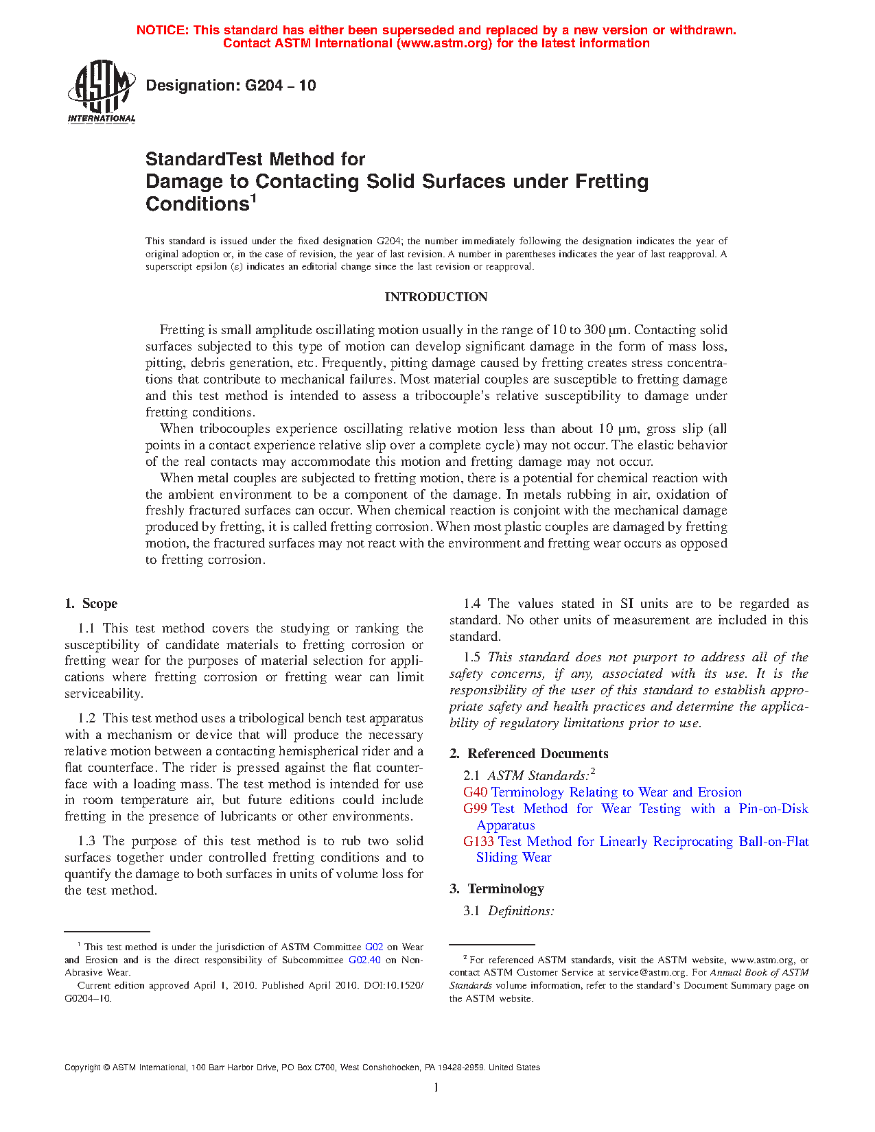 1.1 This test method covers the studying or ranking the susceptibility of candidate materials to fretting corrosion or fretting wear for the purposes of material selection for applications where fretting corrosion or fretting wear can limit serviceability.