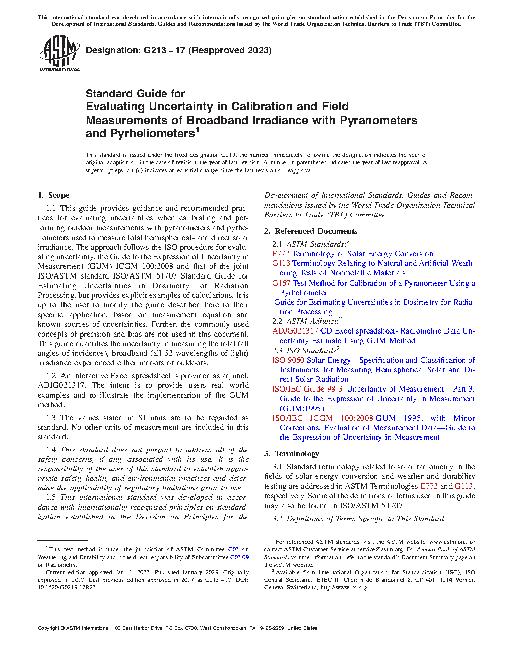 1.1 This guide provides guidance and recommended practices for evaluating uncertainties when calibrating and performing outdoor measurements with pyranometers and pyrheliometers used to measure total hemispherical- and direct solar irradiance. The approach follows the ISO procedure for evaluating uncertainty, the Guide to the Expression of Uncertainty in Measurement (GUM) JCGM 100:2008 and that of the joint ISO/ASTM standard ISO/ASTM 51707 Standard Guide for Estimating Uncertainties in Dosimetry for Radiation Processing, but provides explicit examples of calculations. It is up to the user to modify the guide described here to their specific application, based on measurement equation and known sources of uncertainties. Further, the commonly used concepts of precision and bias are not used in this document. This guide quantifies the uncertainty in measuring the total (all angles of incidence), broadband (all 52 wavelengths of light) irradiance experienced either indoors or outdoors.