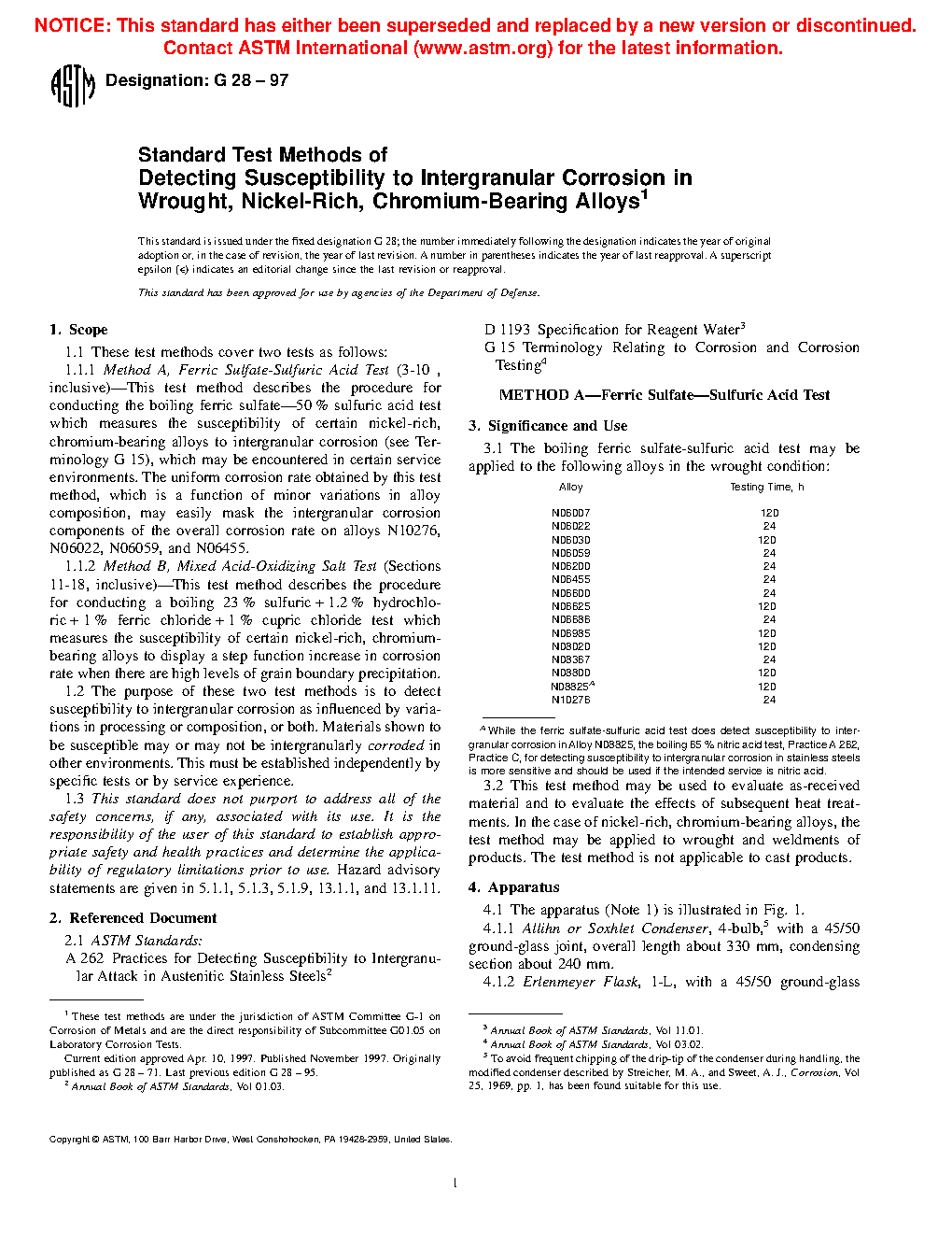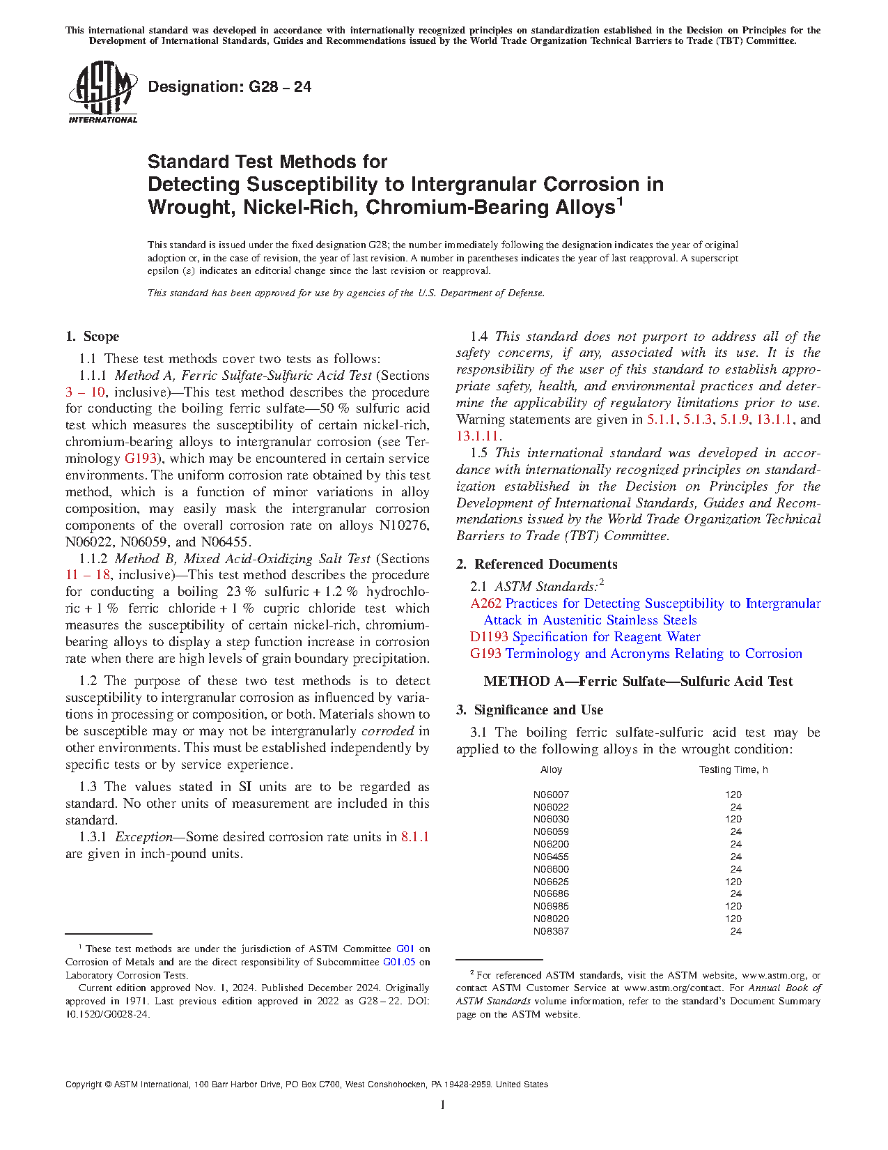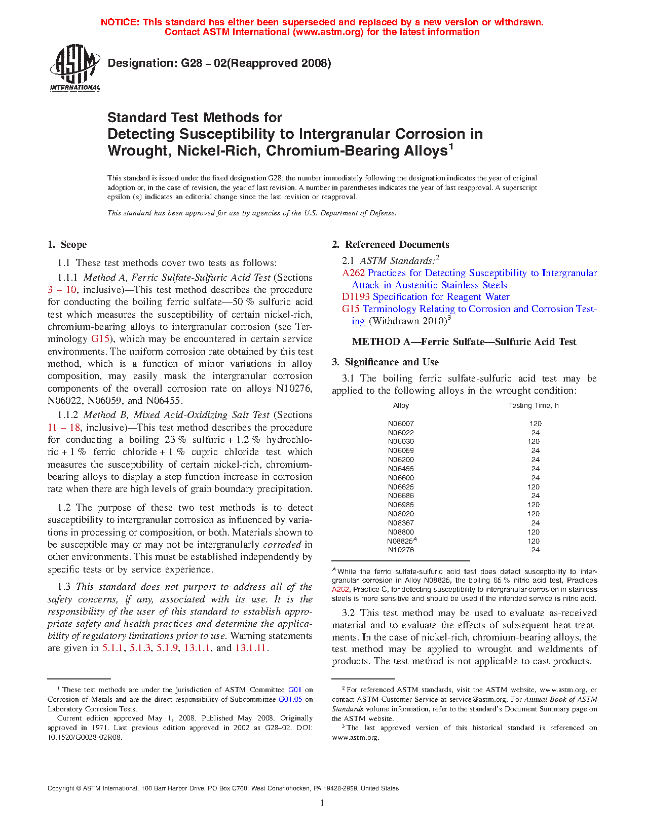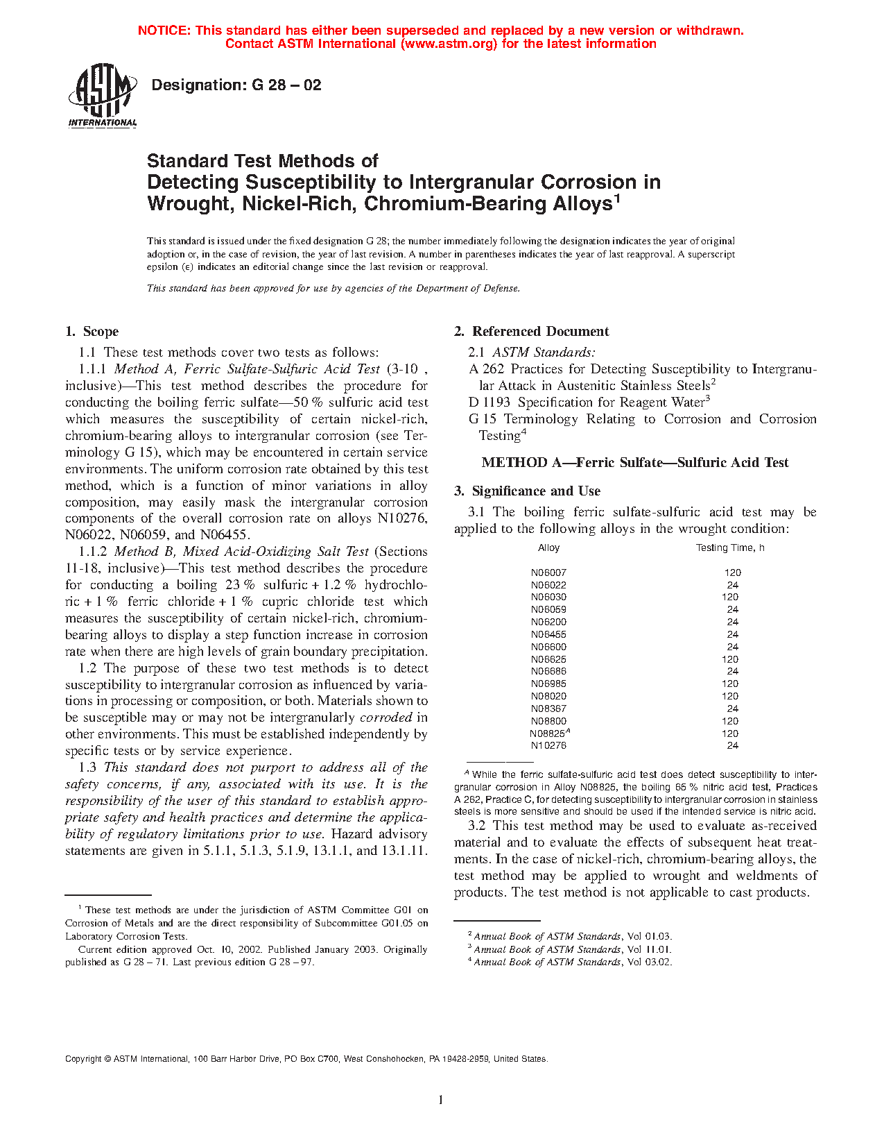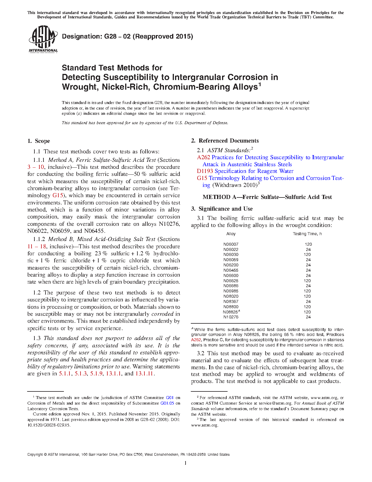 1.1.1 Method A, Ferric Sulfate-Sulfuric Acid Test (Sections 3 through 10, inclusive)-This test method describes the procedure for conducting the boiling ferric sulfate-50% sulfuric acid test which measures the susceptibility of certain nickel-rich, chromium-bearing alloys to intergranular corrosion (see Terminology G15), which may be encountered in certain service environments. The uniform corrosion rate obtained by this test method, which is a function of minor variations in alloy composition, may easily mask the intergranular corrosion components of the overall corrosion rate on alloys N10276, N06022, N06059, and N06455.