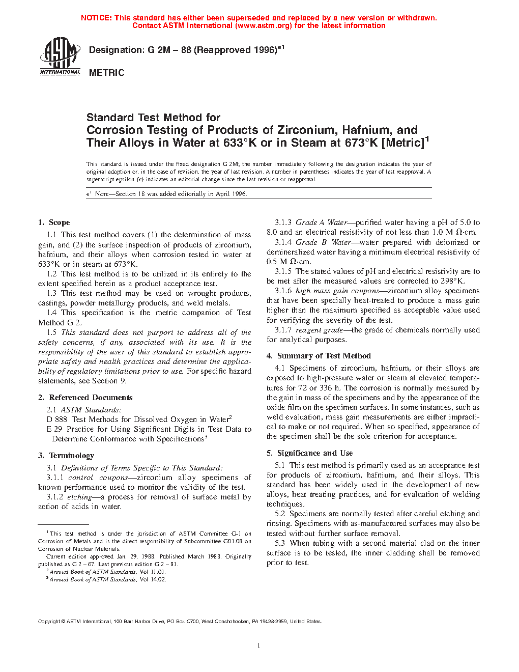 1.1 This test method covers (1) the determination of mass gain, and (2) the surface inspection of products of zirconium, hafnium, and their alloys when corrosion tested in water at 633°K or in steam at 673°K.