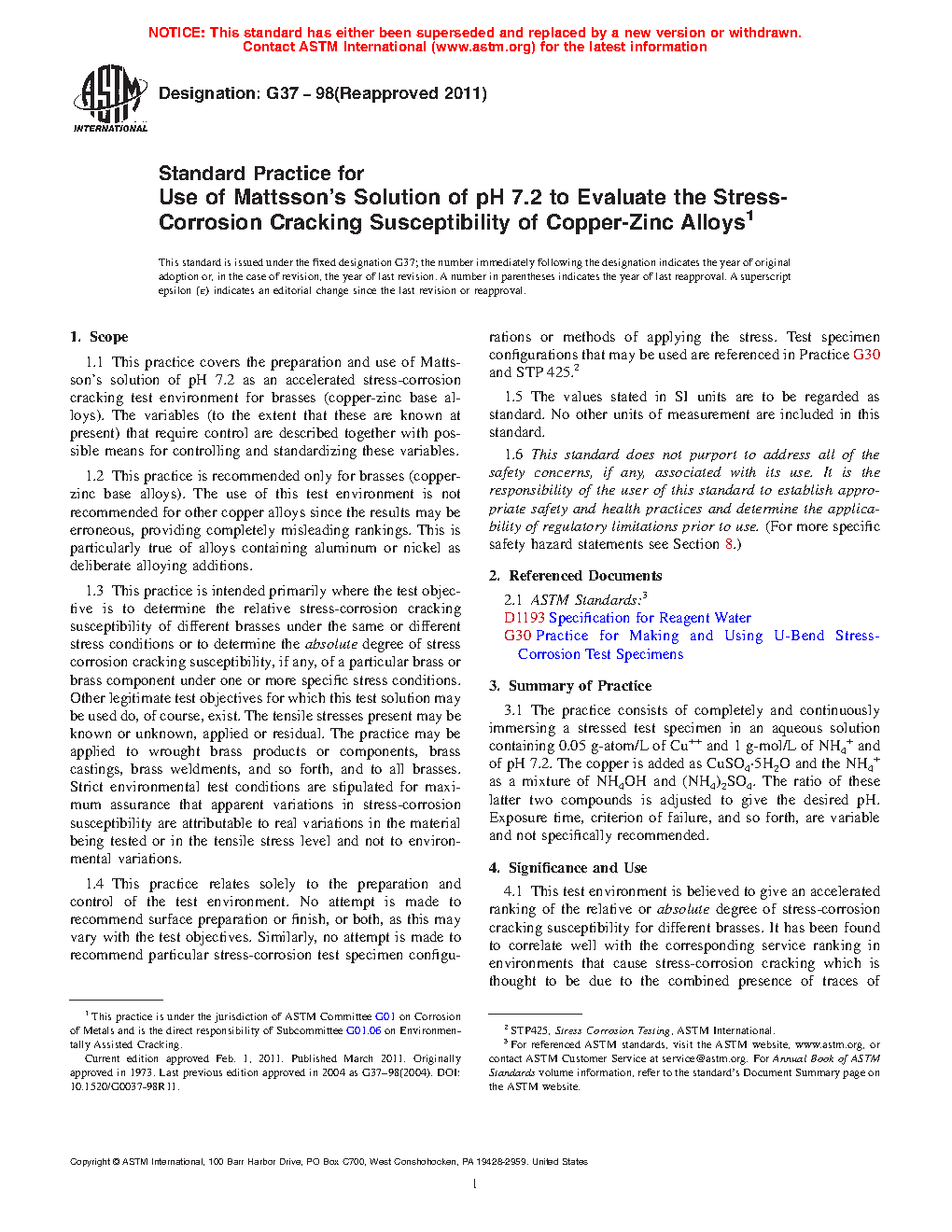1.1 This practice covers the preparation and use of Mattsson’s solution of pH 7.2 as an accelerated stress-corrosion cracking test environment for brasses (copper-zinc base alloys). The variables (to the extent that these are known at present) that require control are described together with possible means for controlling and standardizing these variables.