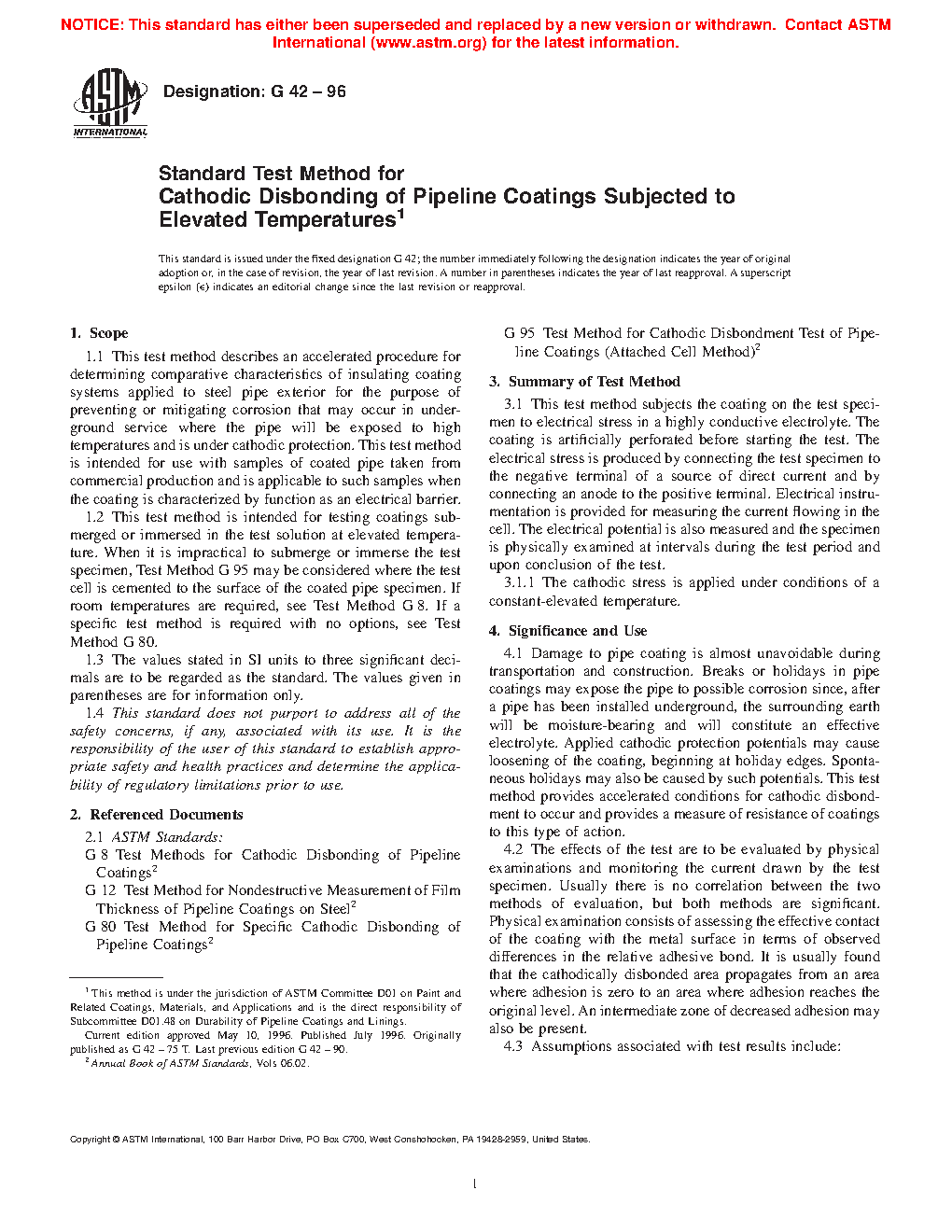 1.2 This test method is intended for testing coatings submerged or immersed in the test solution at elevated temperature. When it is impractical to submerge or immerse the test specimen, Test Method G95 may be considered where the test cell is cemented to the surface of the coated pipe specimen. If room temperatures are required, see Test Methods G8. If a specific test method is required with no options, see Test Method G80.