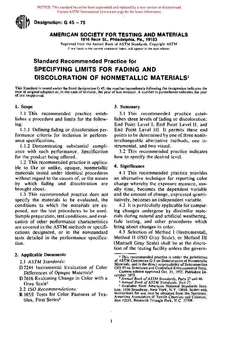Recommended Practice for Specifying Limits for Fading and Discoloration of Nonmetallic Materials (Withdrawn 1981)