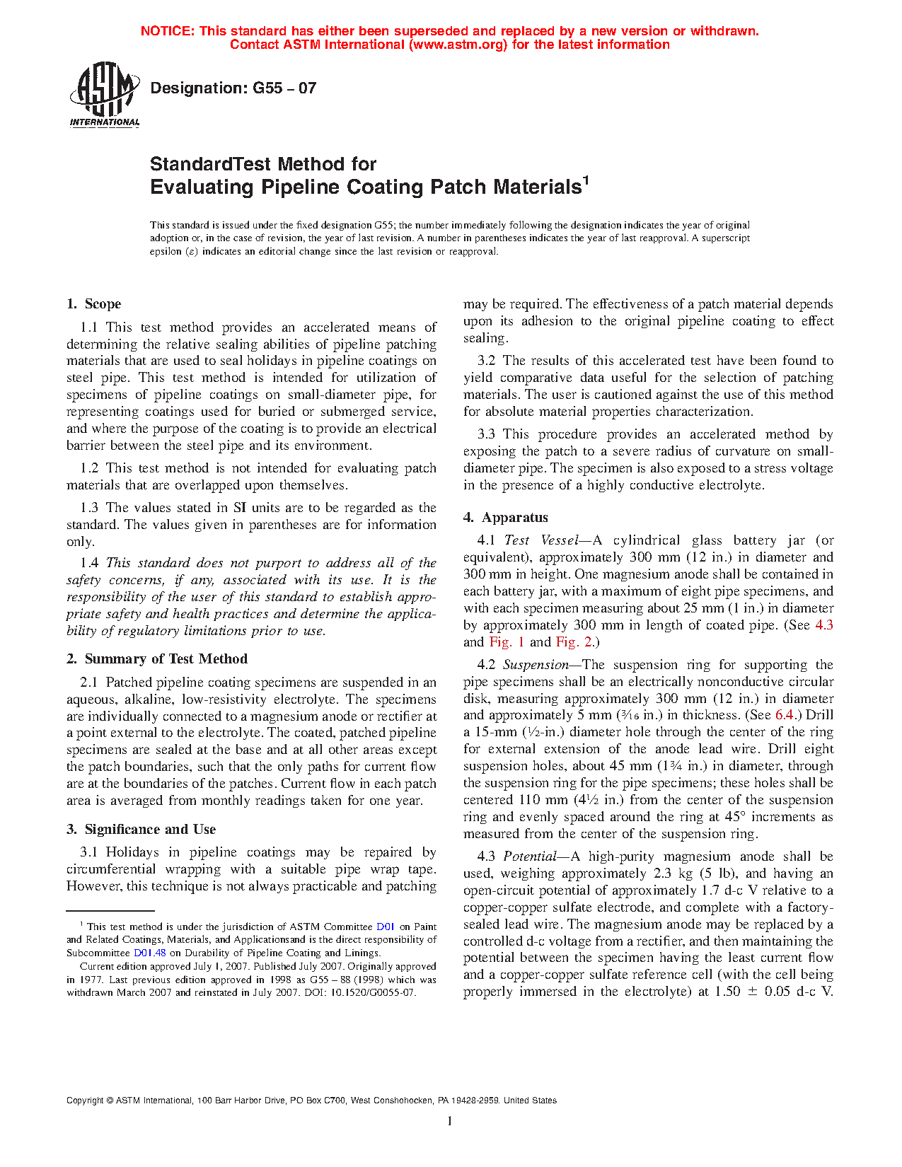 1.1 This test method provides an accelerated means of determining the relative sealing abilities of pipeline patching materials that are used to seal holidays in pipeline coatings on steel pipe. This test method is intended for utilization of specimens of pipeline coatings on small-diameter pipe, for representing coatings used for buried or submerged service, and where the purpose of the coating is to provide an electrical barrier between the steel pipe and its environment.