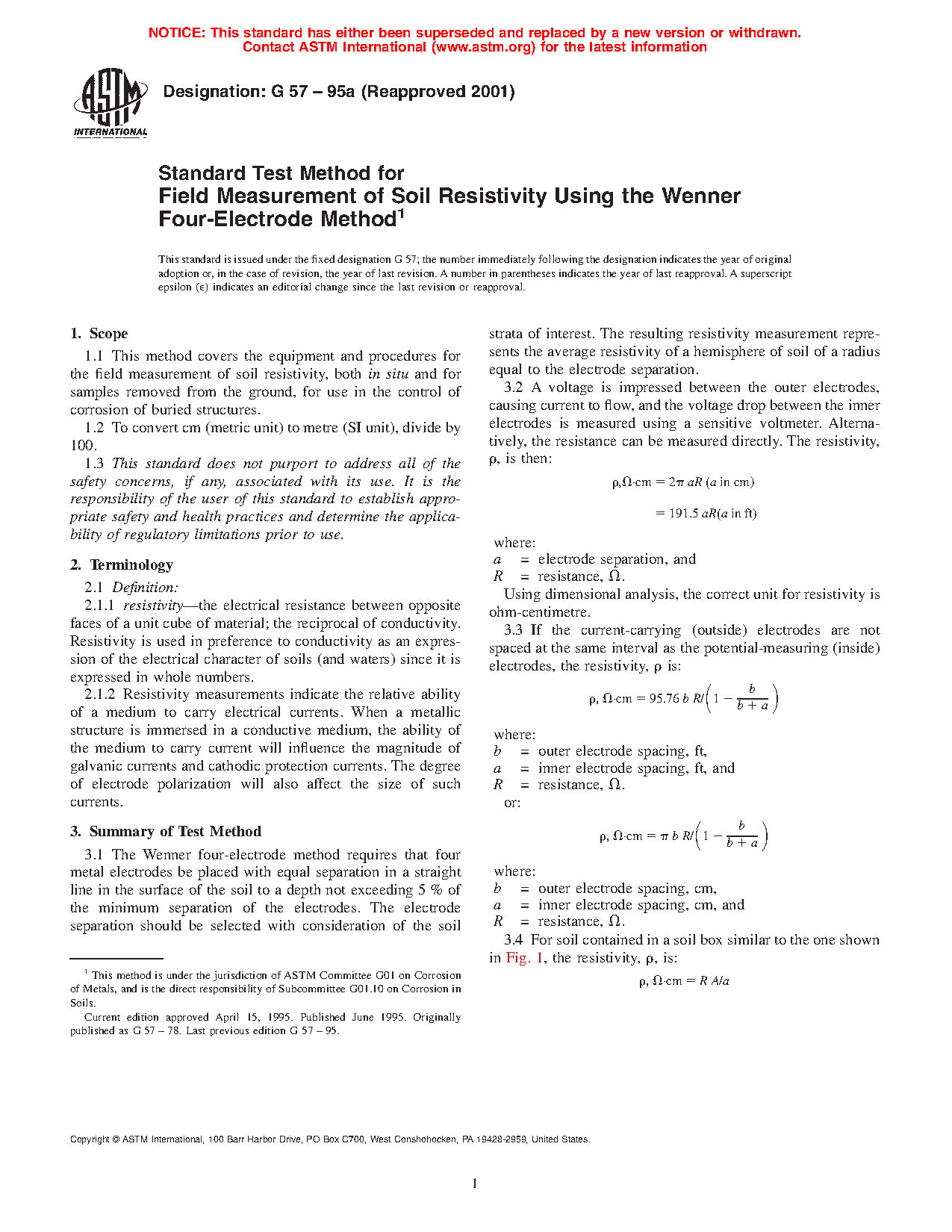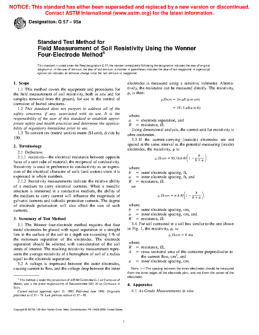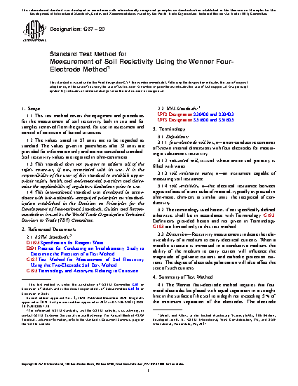 1.1 This test method covers the equipment and procedures for the field measurement of soil resistivity, both in situ and for samples removed from the ground, for use in the control of corrosion of buried structures.