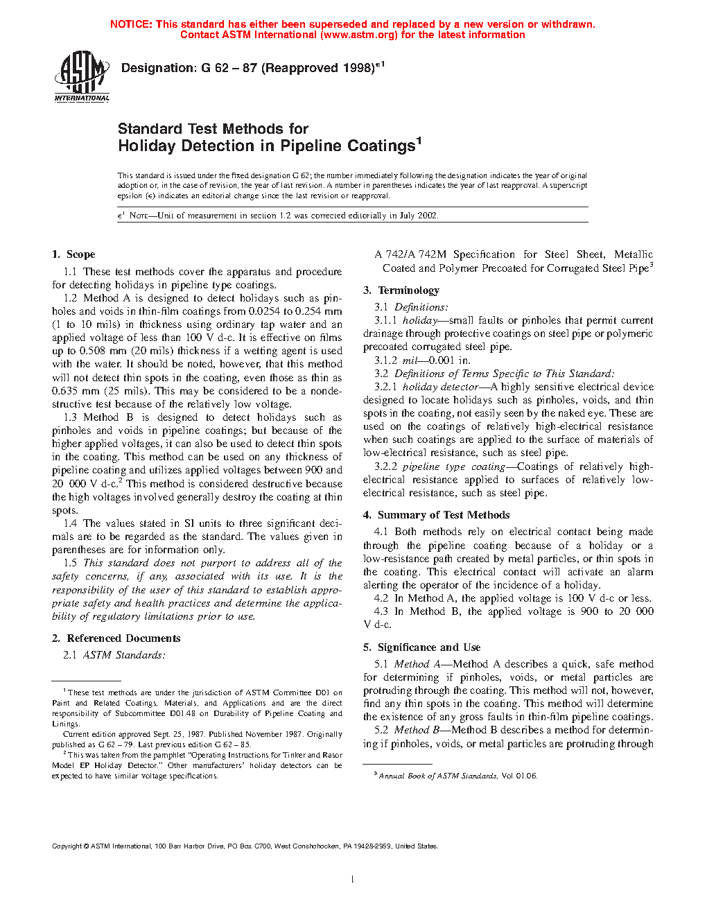 1.2 Method A is designed to detect holidays such as pinholes and voids in thin-film coatings from 0.025 to 0.254 mm (1 to 10 mils) in thickness using ordinary tap water and an applied voltage of less than 100 V d-c. It is effective on films up to 0.508 mm (20 mils) thickness if a wetting agent is used with the water. It should be noted, however, that this method will not detect thin spots in the coating. This may be considered to be a nondestructive test because of the relatively low voltage.