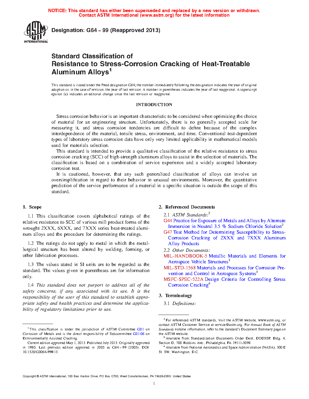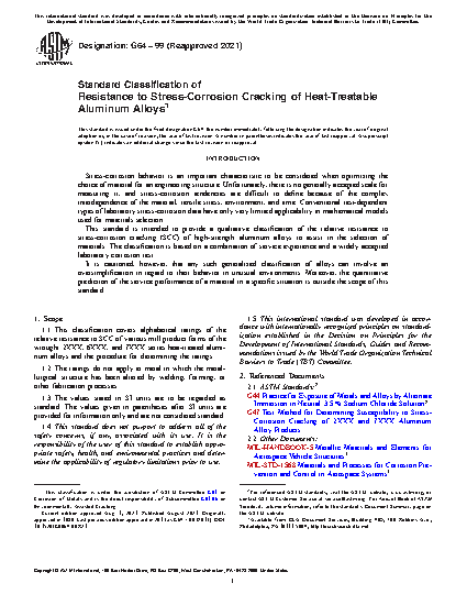 1.1 This classification covers alphabetical ratings of the relative resistance to SCC of various mill product forms of the wrought 2XXX, 6XXX, and 7XXX series heat-treated aluminum alloys and the procedure for determining the ratings.