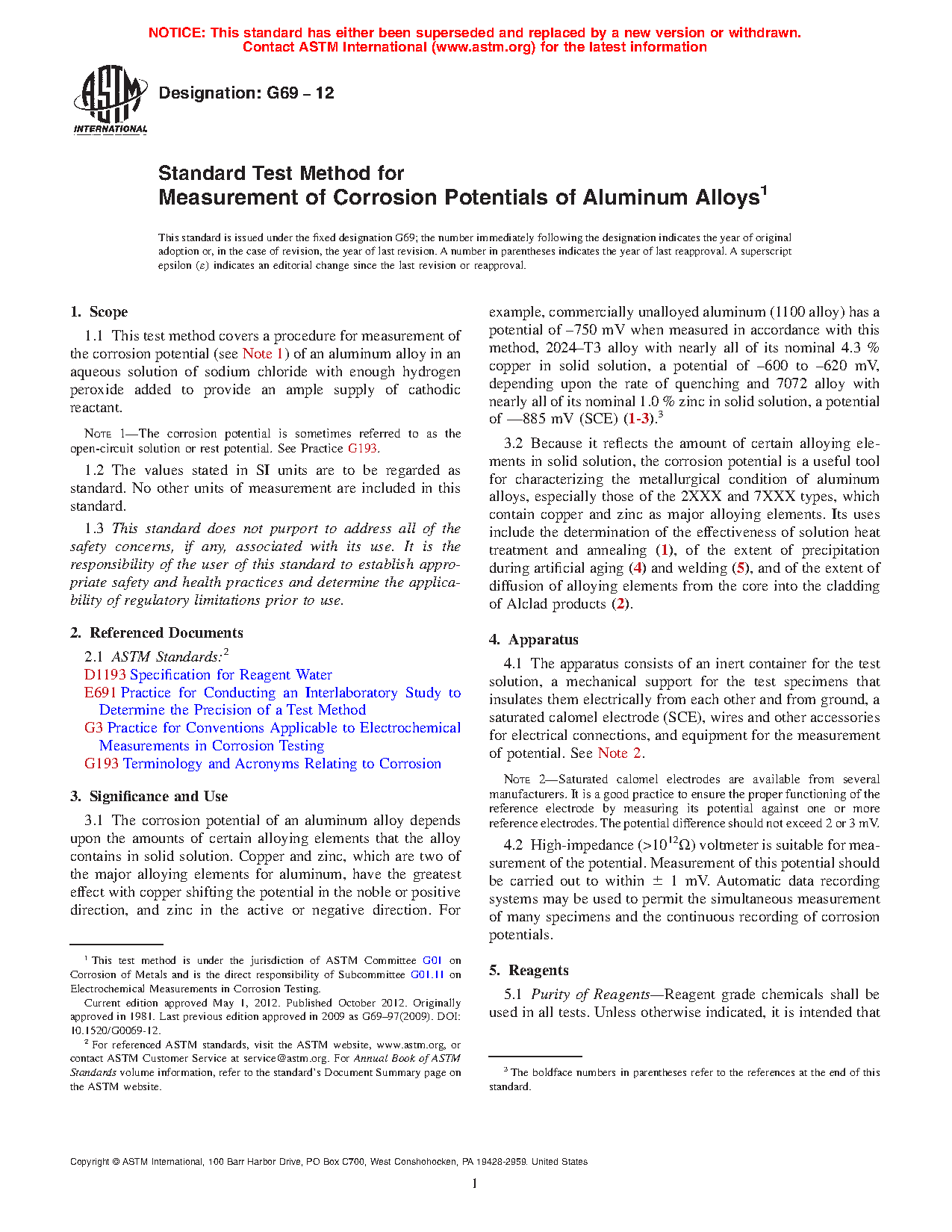 1.1 This test method covers a procedure for measurement of the corrosion potential (see Note 1) of an aluminum alloy in an aqueous solution of sodium chloride with enough hydrogen peroxide added to provide an ample supply of cathodic reactant.