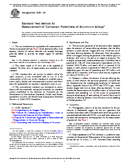 1.1 This test method covers a procedure for measurement of the corrosion potential (see Note 1) of an aluminum alloy in an aqueous solution of sodium chloride with enough hydrogen peroxide added to provide an ample supply of cathodic reactant.