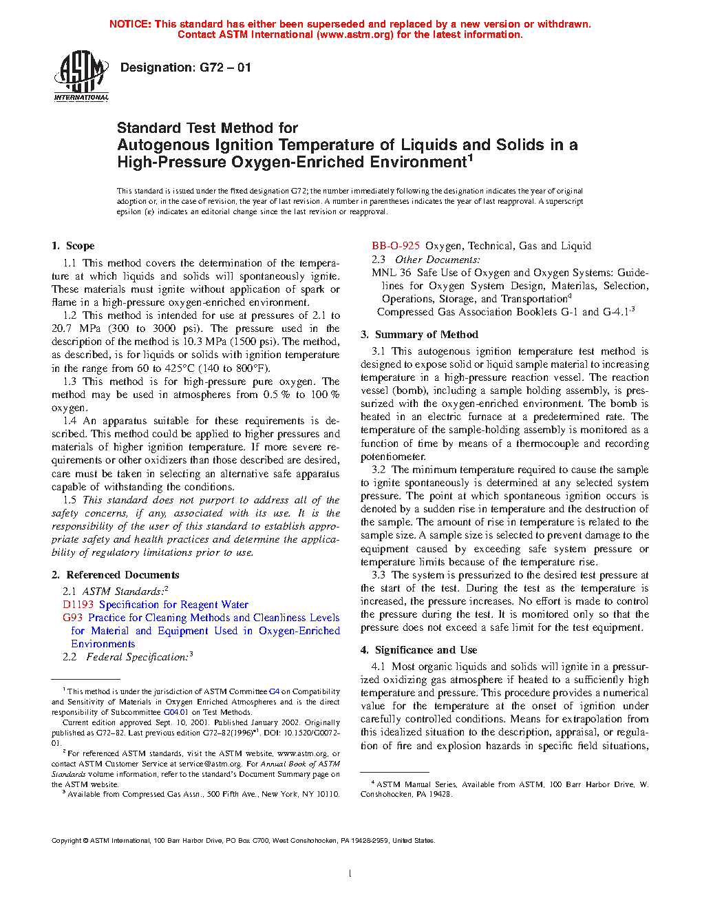 1.4 An apparatus suitable for these requirements is described. This method could be applied to higher pressures and materials of higher ignition temperature. If more severe requirements or other oxidizers than those described are desired, care must be taken in selecting an alternative safe apparatus capable of withstanding the conditions.