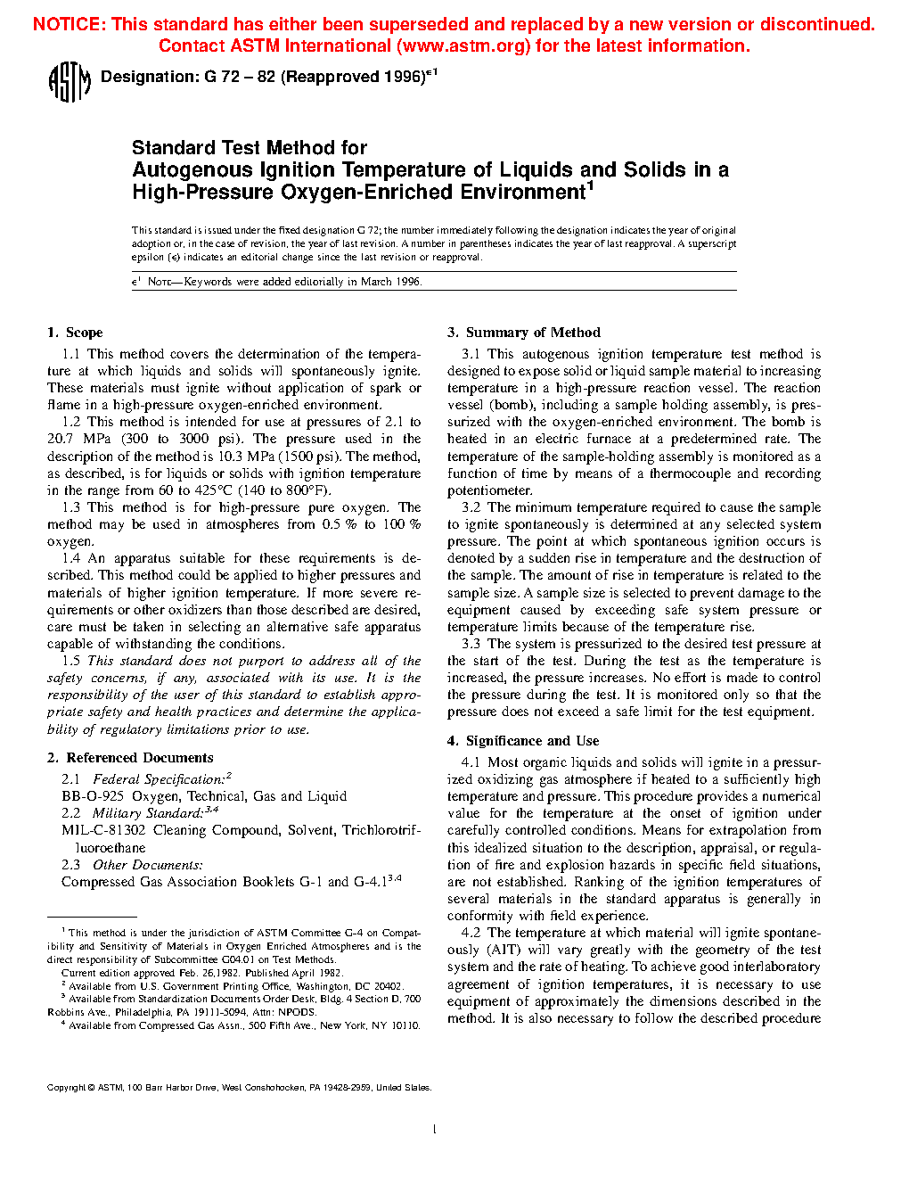 1.1 This method covers the determination of the temperature at which liquids and solids will spontaneously ignite. These materials must ignite without application of spark or flame in a high-pressure oxygen-enriched environment.