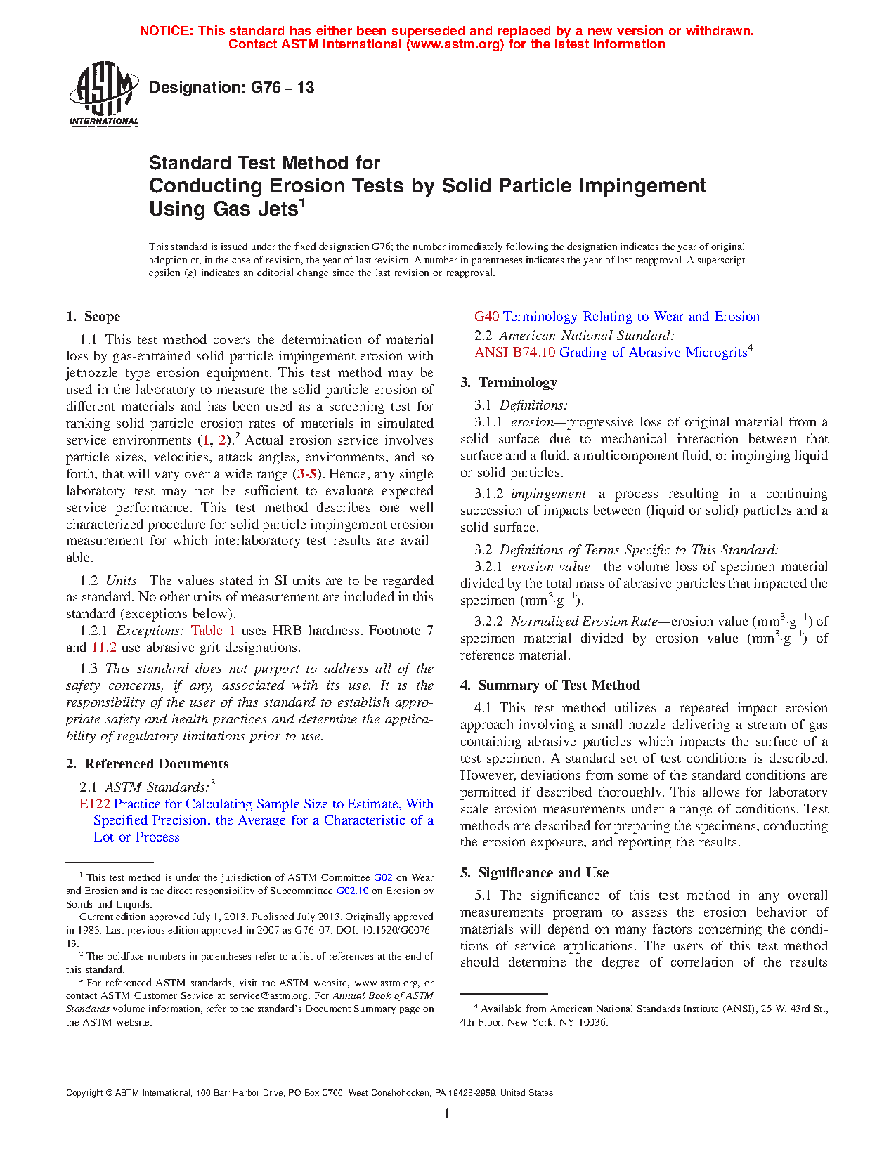 1.1 This test method covers the determination of material loss by gas-entrained solid particle impingement erosion with jetnozzle type erosion equipment. This test method may be used in the laboratory to measure the solid particle erosion of different materials and has been used as a screening test for ranking solid particle erosion rates of materials in simulated service environments (1, 2). Actual erosion service involves particle sizes, velocities, attack angles, environments, etc., that will vary over a wide range (3-5). Hence, any single laboratory test may not be sufficient to evaluate expected service performance. This test method describes one well characterized procedure for solid particle impingement erosion measurement for which interlaboratory test results are available.