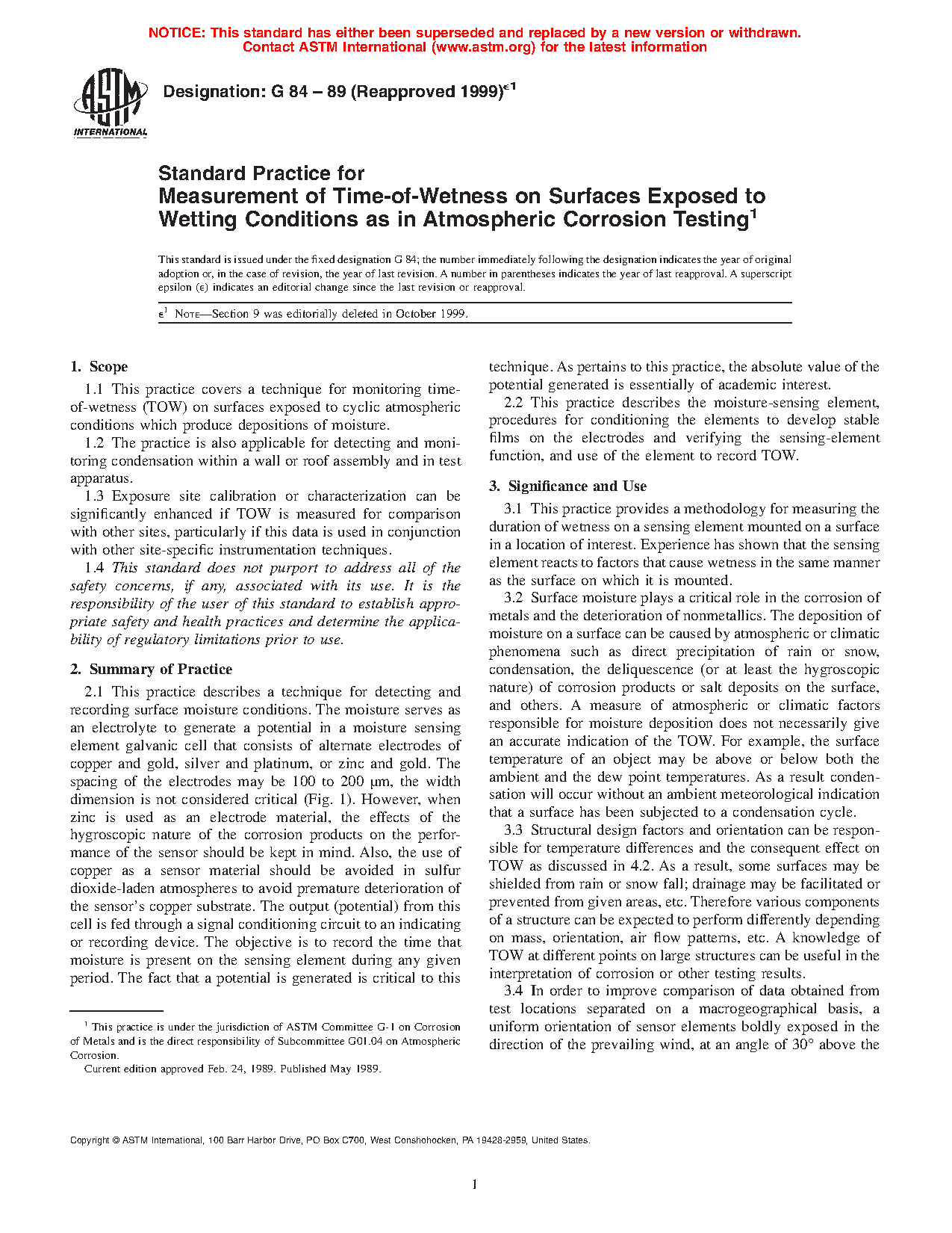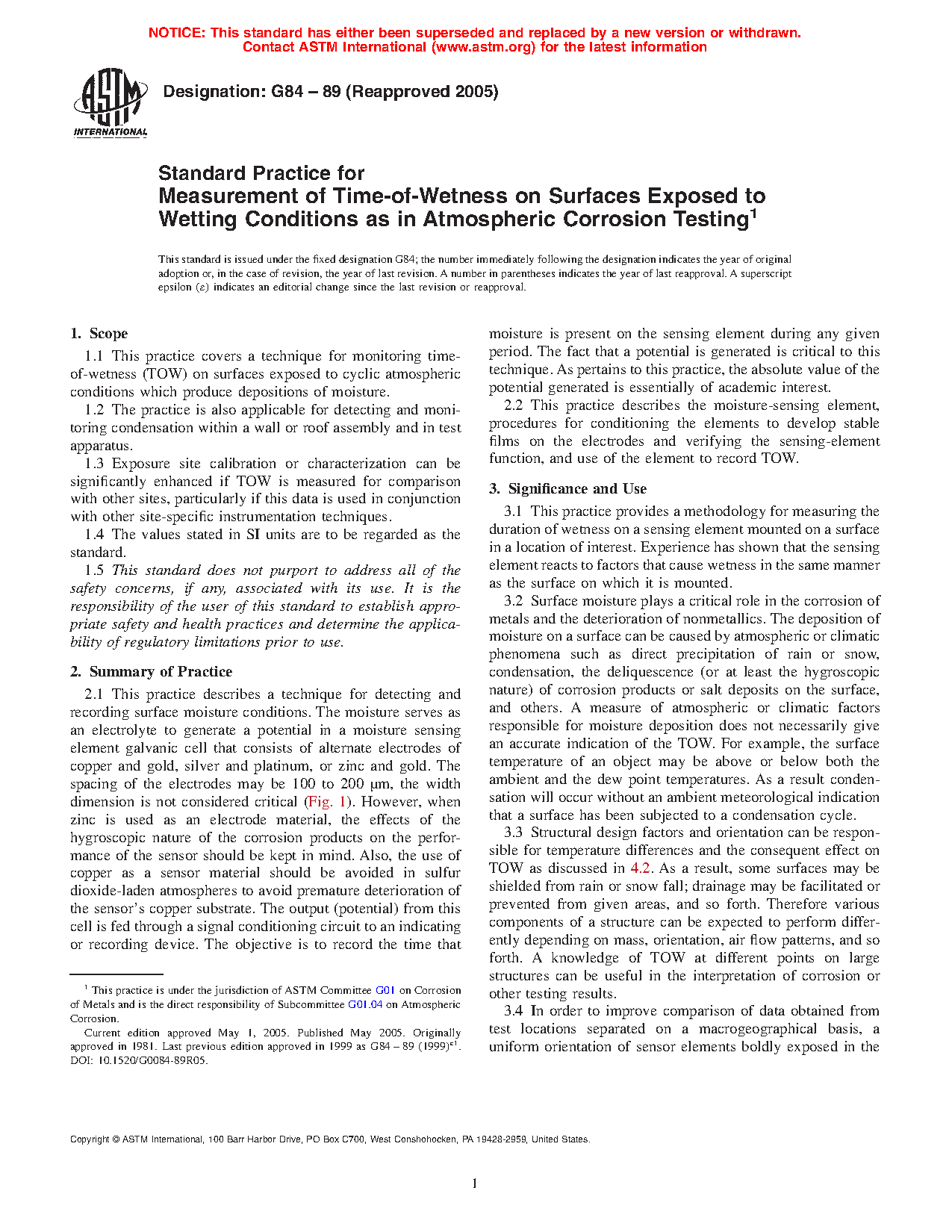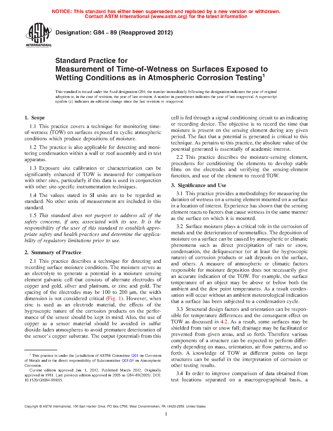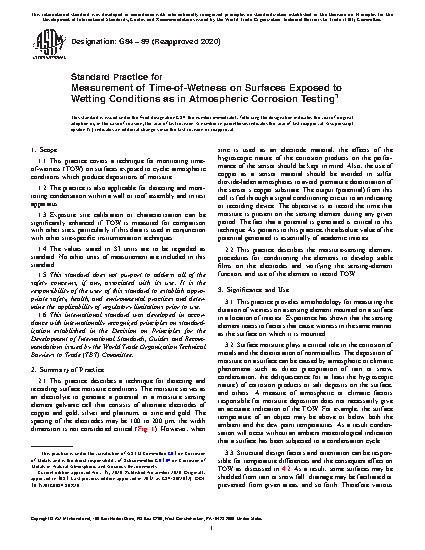 1.1 This practice covers a technique for monitoring time-of-wetness (TOW) on surfaces exposed to cyclic atmospheric conditions which produce depositions of moisture.
