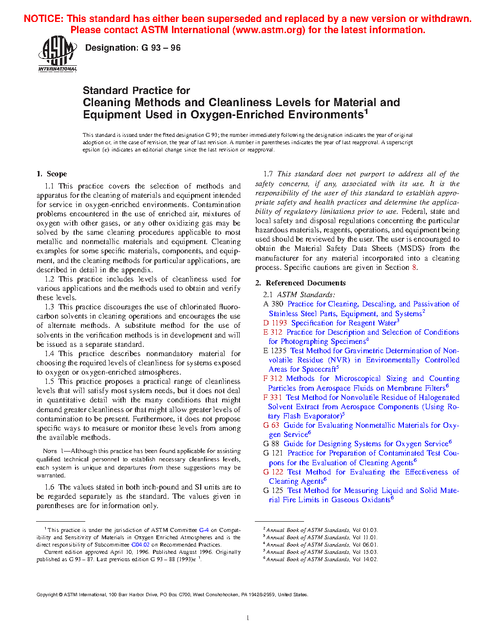 Examples of cleaning procedures contained herein may be followed or specified for those materials, components, and equipment indicated. The general cleaning text can be used to establish cleaning procedures for materials, components, equipment, and applications not addressed in detail. See Guide G127 for discussion of cleaning agent and procedure selection.