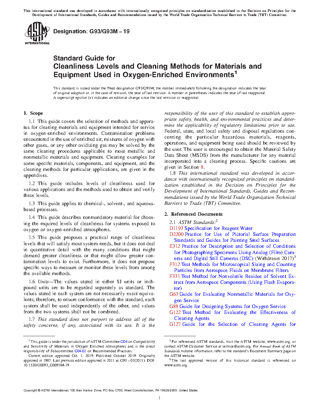 1.4 There are no specific applicable limits (for example, oxygen pressure, temperature) to the presented concepts and approaches regarding cleaning, cleanliness inspection, and preservation of cleanliness for oxygen service equipment. Rather, basic principles, best practices, and common methods are described which may be used across a broad range of applications, though some may be better suited to certain materials, types of equipment, or applications.