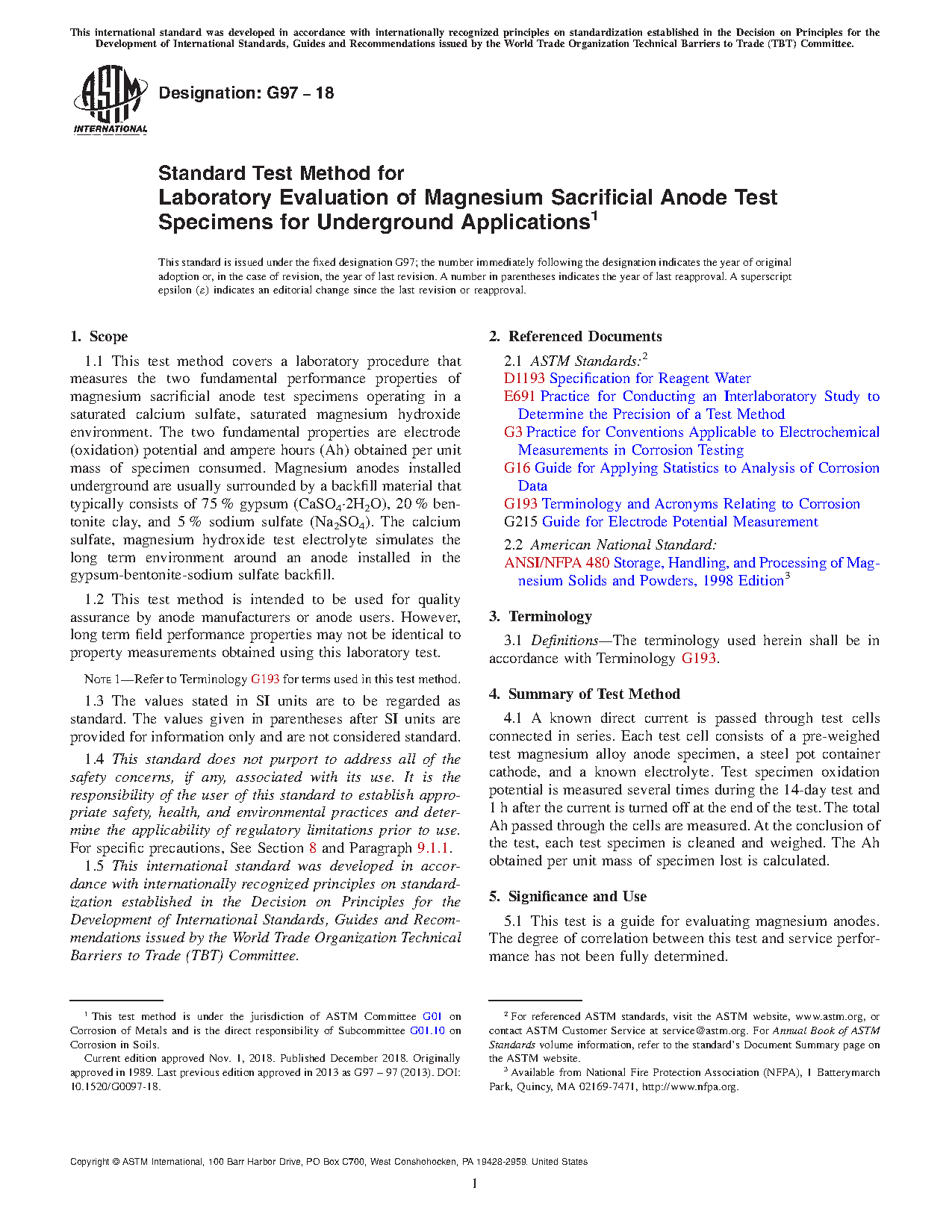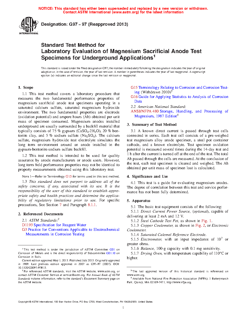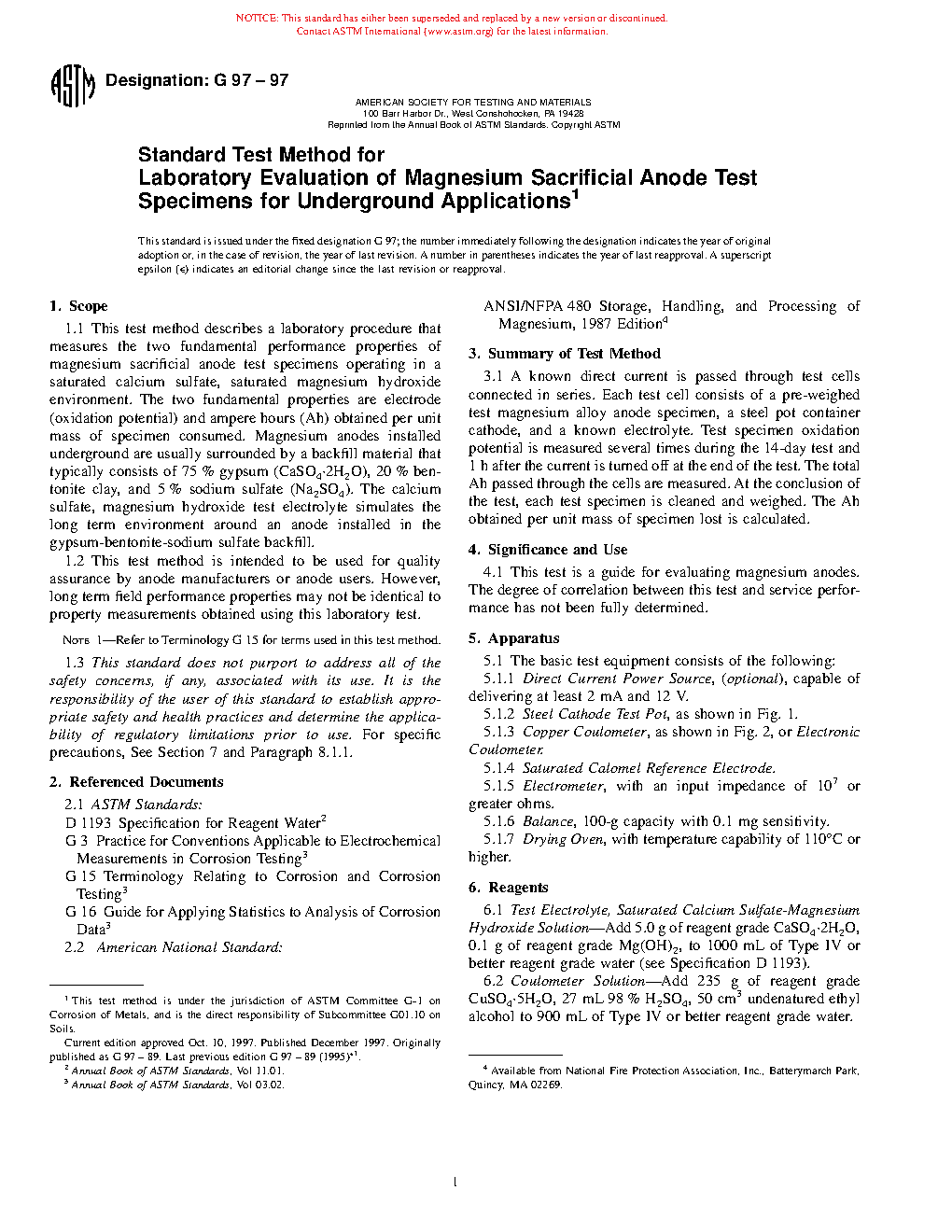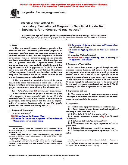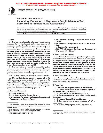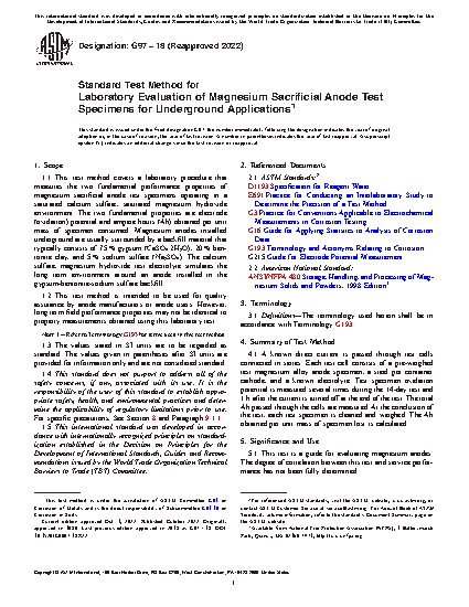 1.1 This test method covers a laboratory procedure that measures the two fundamental performance properties of magnesium sacrificial anode test specimens operating in a saturated calcium sulfate, saturated magnesium hydroxide environment. The two fundamental properties are electrode (oxidation potential) and ampere hours (Ah) obtained per unit mass of specimen consumed. Magnesium anodes installed underground are usually surrounded by a backfill material that typically consists of 75 % gypsum (CaSO4·2H 2O), 20 % bentonite clay, and 5 % sodium sulfate (Na 2SO4). The calcium sulfate, magnesium hydroxide test electrolyte simulates the long term environment around an anode installed in the gypsum-bentonite-sodium sulfate backfill.