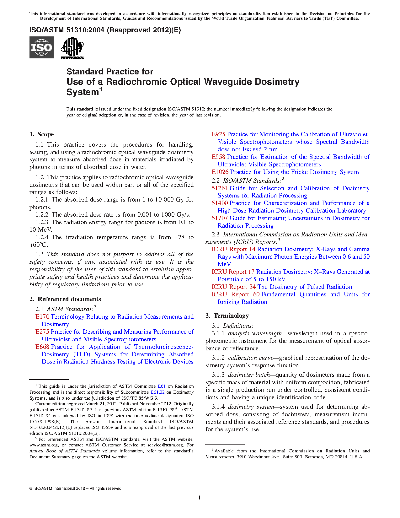 1.4 This practice applies to radiochromic optical waveguide dosimeters that can be used within part or all of the specified ranges as follows: