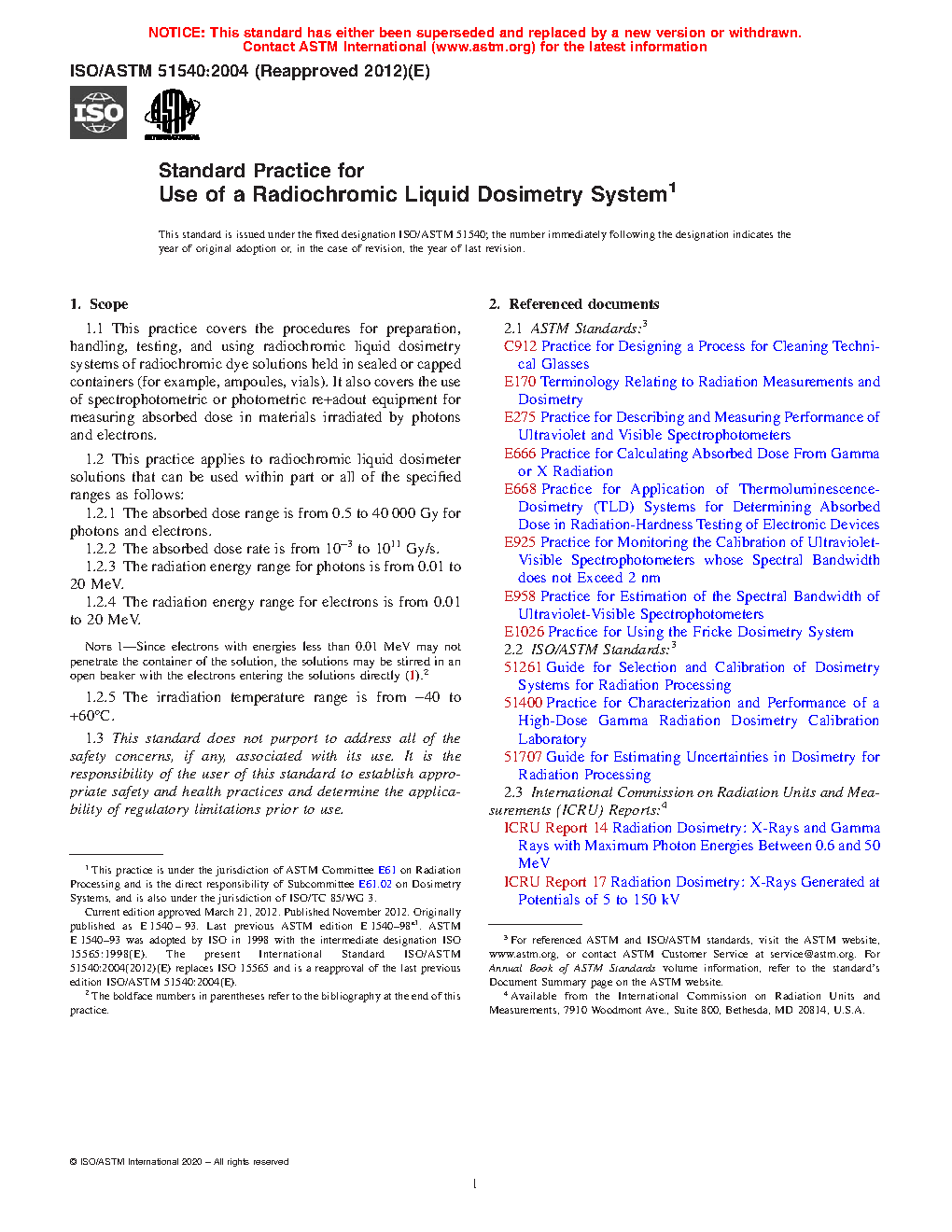 1.1 This practice covers the procedures for preparation, handling, testing, and using radiochromic liquid dosimetry systems of radiochromic dye solutions held in sealed or capped containers (for example, ampoules, vials). It also covers the use of spectrophotometric or photometric readout equipment for measuring absorbed dose in materials irradiated by photons and electrons.